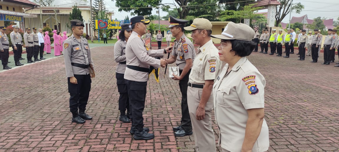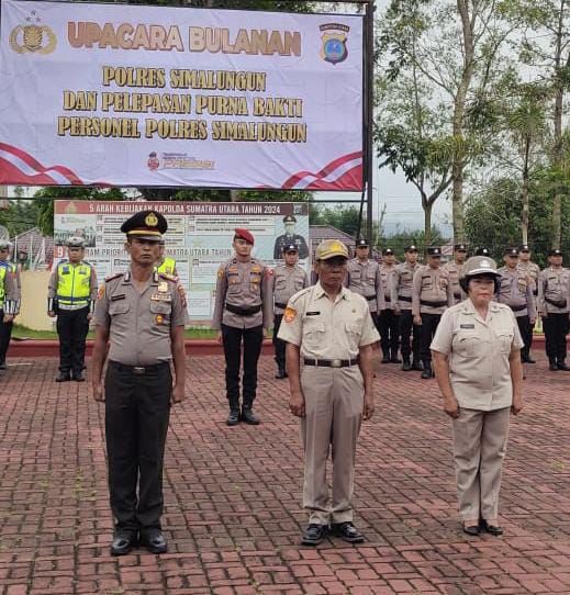 Upacara Bendera Polres Simalungun Diwarnai Pelepasan Tiga Purna Bakti: “Terima Kasih atas Dharma Bakti”