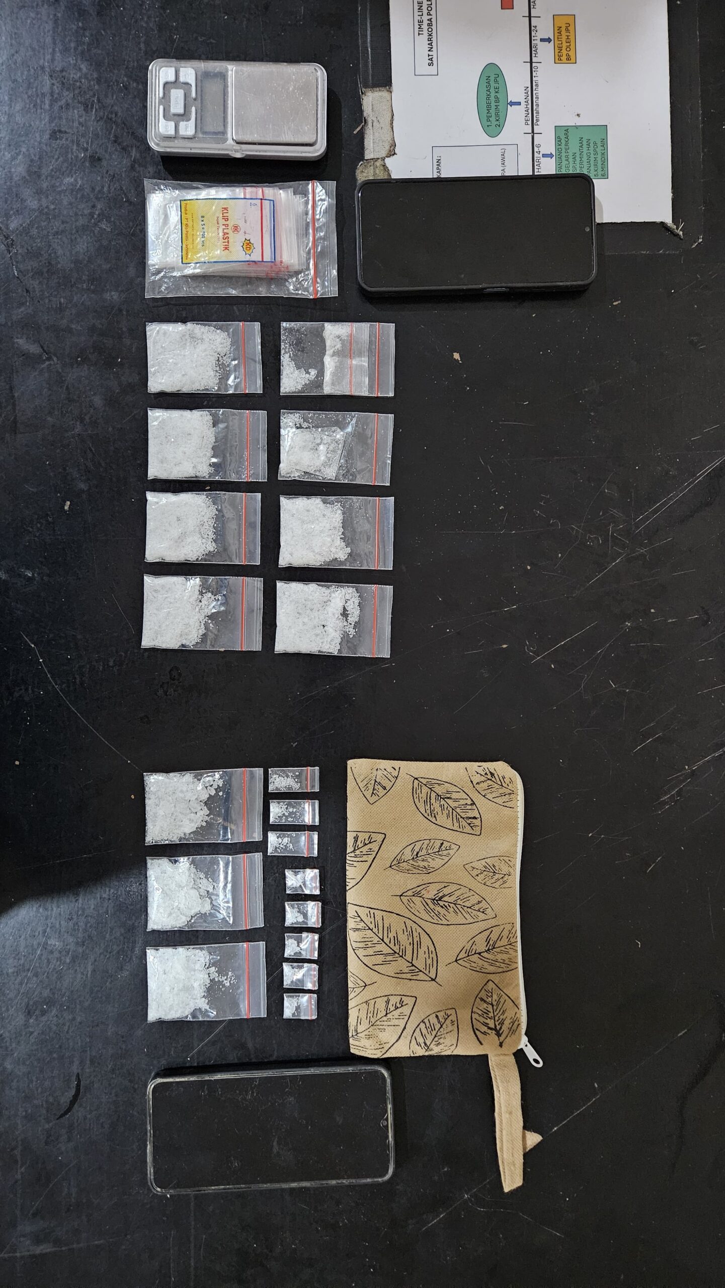 Total barang bukti yang berhasil diamankan dalam operasi ini sungguh mencengangkan dan menunjukkan skala operasi yang masif. Tim berhasil menyita 11 bungkus plastik klip besar berisi diduga narkotika jenis sabu, 8 bungkus plastik klip kecil berisi diduga sabu dengan berat bruto total 51,75 gram, dua unit handphone Android merk Oppo berwarna hitam dan biru, satu timbangan digital berkualitas tinggi, satu bal plastik klip kosong untuk pengemasan, dan satu tas kecil warna coklat.