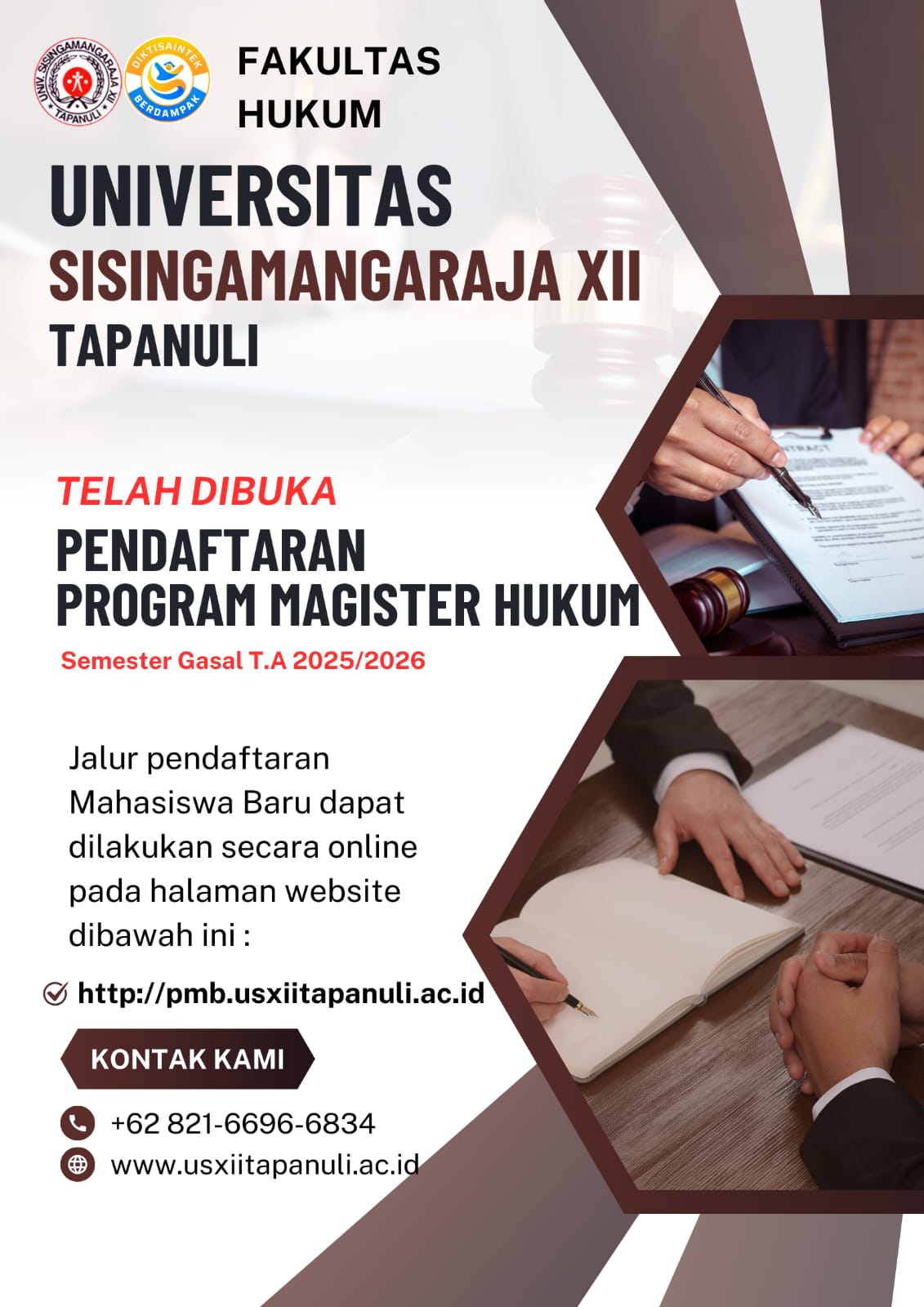 Tapanuli, 30 Agustus 2025 – Universitas Sisingamangaraja XII Tapanuli melalui Fakultas Hukum resmi membuka pendaftaran mahasiswa baru untuk Program Magister Hukum (S2) pada Semester Gasal Tahun Akademik 2025/2026.