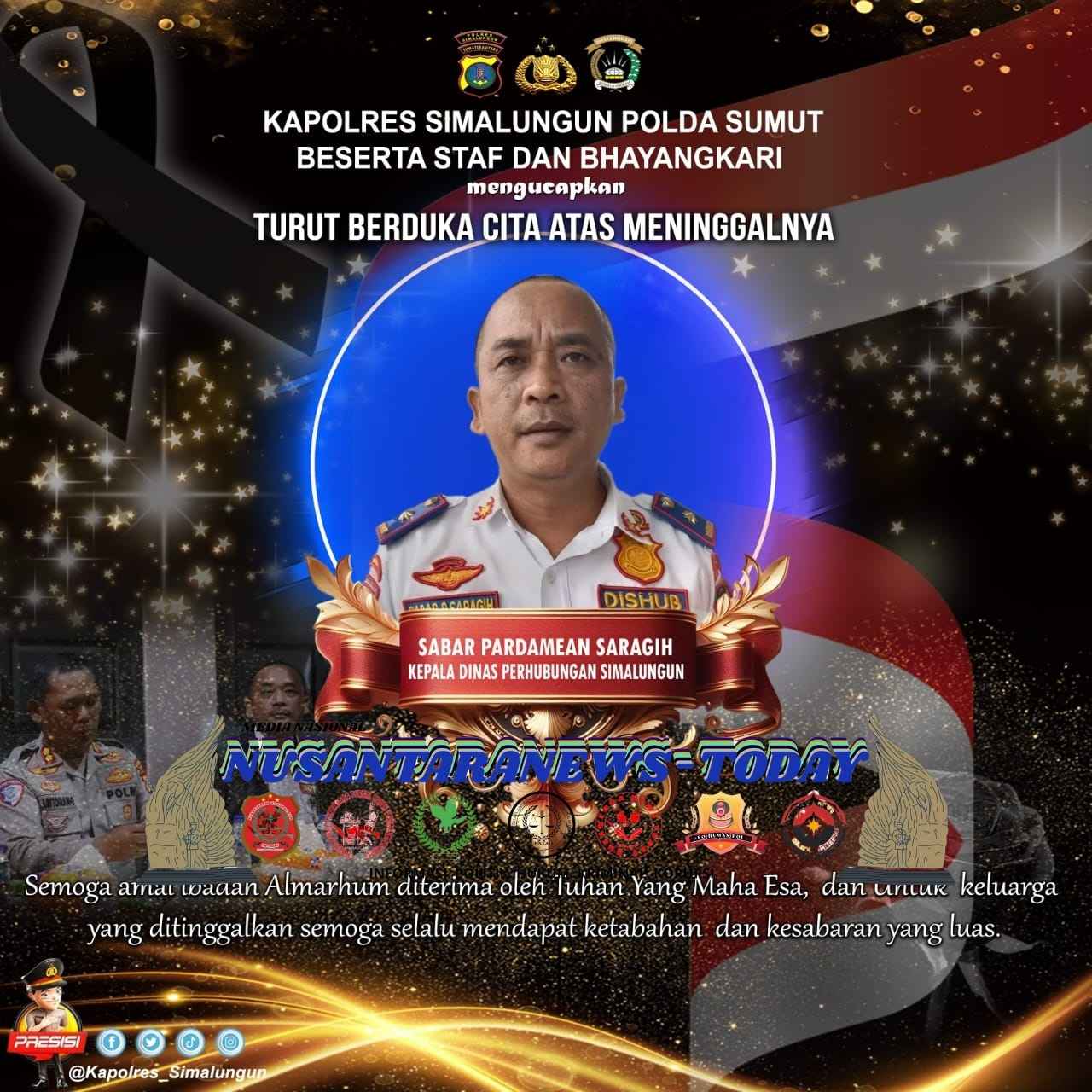 Simalungun,Nusantaranews.Today.com – Kesedihan mendalam menyelimuti jajaran Kepolisian Resort (Polres) Simalungun menyusul meninggalnya Kepala Dinas Perhubungan Kabupaten Simalungun, Sabar Pardamean Saragih. Kapolres Simalungun AKBP Marganda Aritonang, S.H., S.I.K., M.M., beserta seluruh staf dan Bhayangkari menyampaikan ucapan belasungkawa yang tulus atas kepergian tokoh penting di lingkungan pemerintahan daerah tersebut.