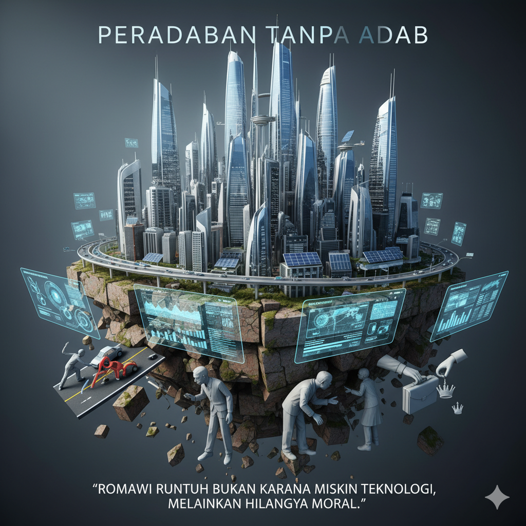 Sejarah sudah mengajarkan: Romawi bukan runtuh karena miskin teknologi, melainkan karena hilangnya moral. Demikian pula banyak bangsa besar lainnya tumbang karena kehilangan adab, bukan karena kekurangan harta.