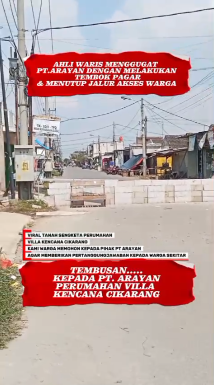 CIKARANG, BEKASI – Ribuan warga Perumahan Villa Kencana Cikarang di Kecamatan Sukatani, Kabupaten Bekasi, kini terisolasi setelah akses jalan utama mereka ditutup total menggunakan tembok beton. Memasuki hari kedelapan, pemblokiran ini menjadi puncak dari sengketa lahan yang tak kunjung usai antara pengembang, PT Arayan, dengan pihak yang mengklaim sebagai ahli waris tanah.
