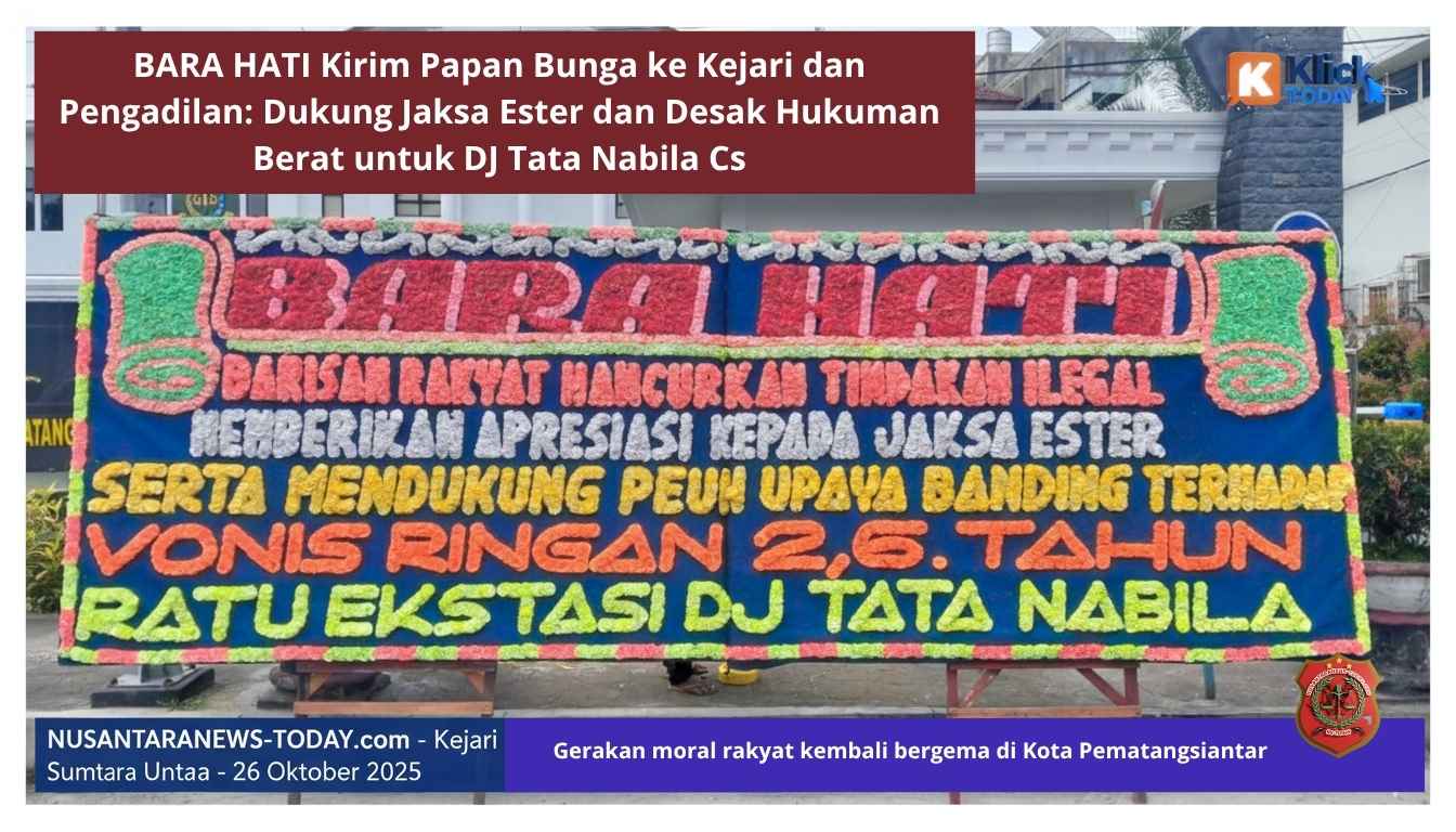 Pematangsiantar — Gerakan moral rakyat kembali bergema di Kota Pematangsiantar. Hari ini, Barisan Rakyat Hancurkan Tindakan Ilegal (BARA HATI) mengirimkan dua papan bunga besar sebagai simbol dukungan dan desakan keadilan. Papan pertama dikirim ke Kantor Kejaksaan Negeri Pematangsiantar di Jalan Sutomo, sebagai bentuk apresiasi dan dukungan moral kepada Jaksa Ester Lauren Putri Harianja, S.H., yang dengan berani mengajukan banding terhadap vonis ringan dalam kasus narkotika DJ Tata Nabila Cs.