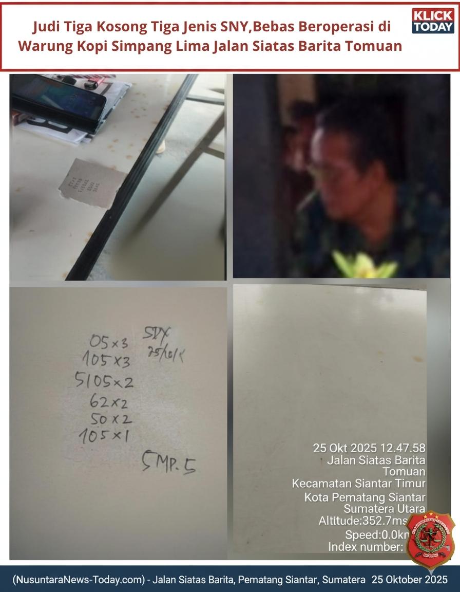 Hasil kutipan awak Media NusantaraNews-Today.com Sabtu 25 Oktober 2025 /Pukul 12:47 Wib ,dari sumber dilokasi yang tidak bersedia dicantumkan indentitasnya ,pada saat dikonfirmasi awak media ,mengatakan bahwa perjudian tiga kosong tiga jenis SNY yang dikendalikan oleh inisial Pak NS bebas tanpa hambatan dan tidak tersentuh Aparat penegak hukum kepolisian Polres Pematangsiantar.