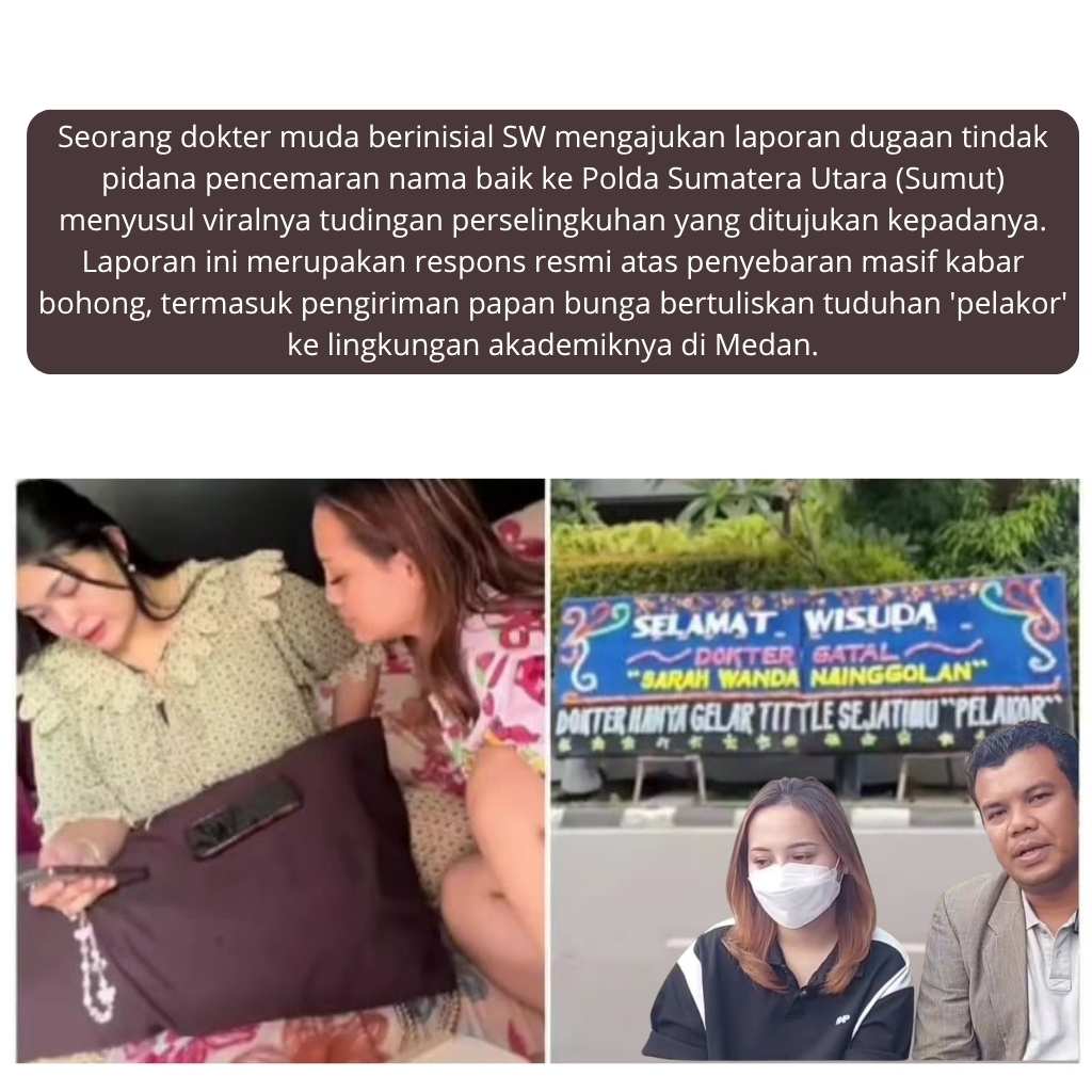 Medan, [16 November 2025] Nusantaranews-Today.con– Seorang dokter muda berinisial SW mengajukan laporan dugaan tindak pidana pencemaran nama baik ke Polda Sumatera Utara (Sumut) menyusul viralnya tudingan perselingkuhan yang ditujukan kepadanya. Laporan ini merupakan respons resmi atas penyebaran masif kabar bohong, termasuk pengiriman papan bunga bertuliskan tuduhan ‘pelakor’ ke lingkungan akademiknya di Medan.