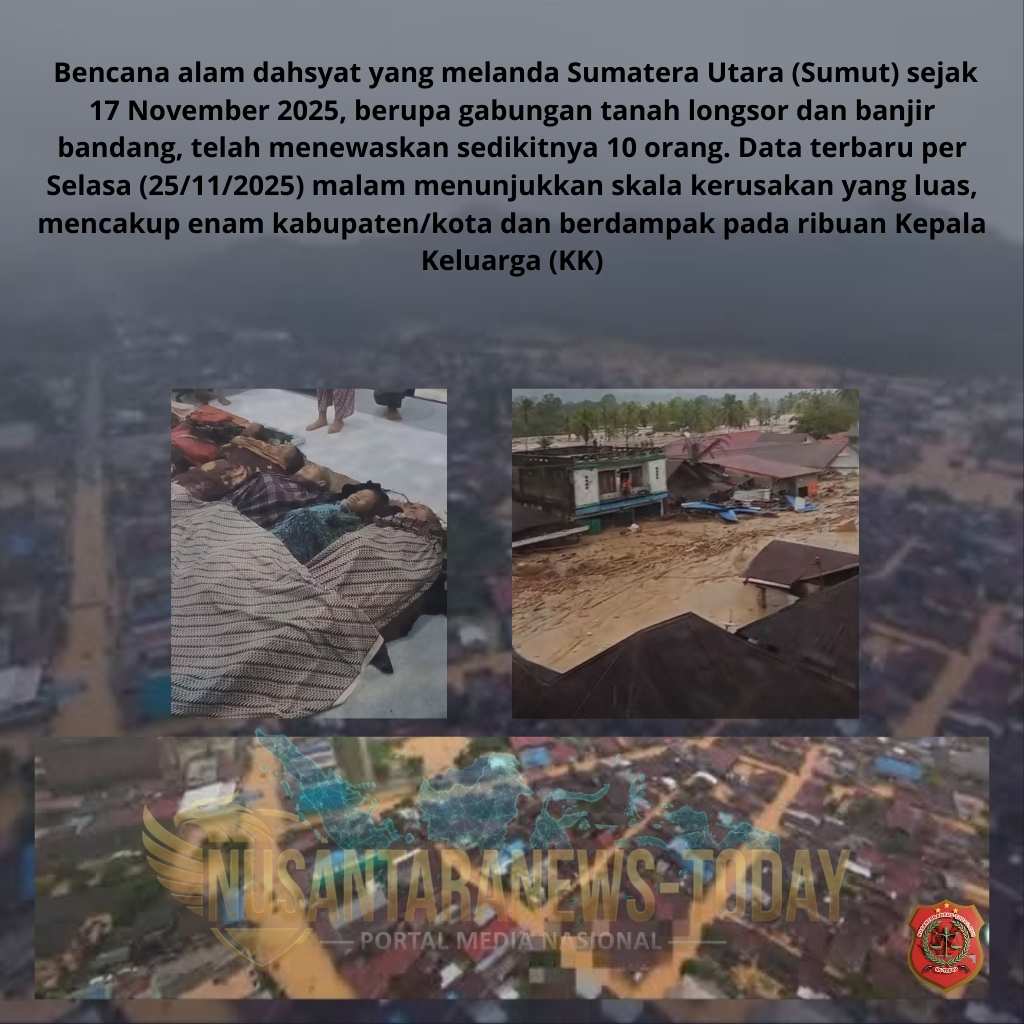 MEDAN – Bencana alam dahsyat yang melanda Sumatera Utara (Sumut) sejak 17 November 2025, berupa gabungan tanah longsor dan banjir bandang, telah menewaskan sedikitnya 10 orang. Data terbaru per Selasa (25/11/2025) malam menunjukkan skala kerusakan yang luas, mencakup enam kabupaten/kota dan berdampak pada ribuan Kepala Keluarga (KK).