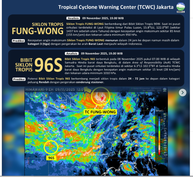 JAKARTA – Badan Meteorologi, Klimatologi, dan Geofisika (BMKG) mengumumkan pembaruan mengenai aktivitas siklon tropis dan bibit siklon yang berpotensi memengaruhi kondisi cuaca di Indonesia. Hingga saat ini, ada dua sistem utama yang menjadi perhatian: Siklon Tropis FUNG-WONG dan Bibit Siklon Tropis 96S.