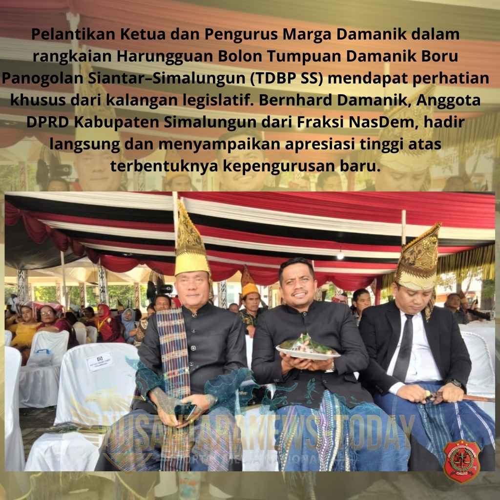 PEMATANGSIANTAR – Pelantikan Ketua dan Pengurus Marga Damanik dalam rangkaian Harungguan Bolon Tumpuan Damanik Boru Panogolan Siantar–Simalungun (TDBP SS) mendapat perhatian khusus dari kalangan legislatif. Bernhard Damanik, Anggota DPRD Kabupaten Simalungun dari Fraksi NasDem, hadir langsung dan menyampaikan apresiasi tinggi atas terbentuknya kepengurusan baru.