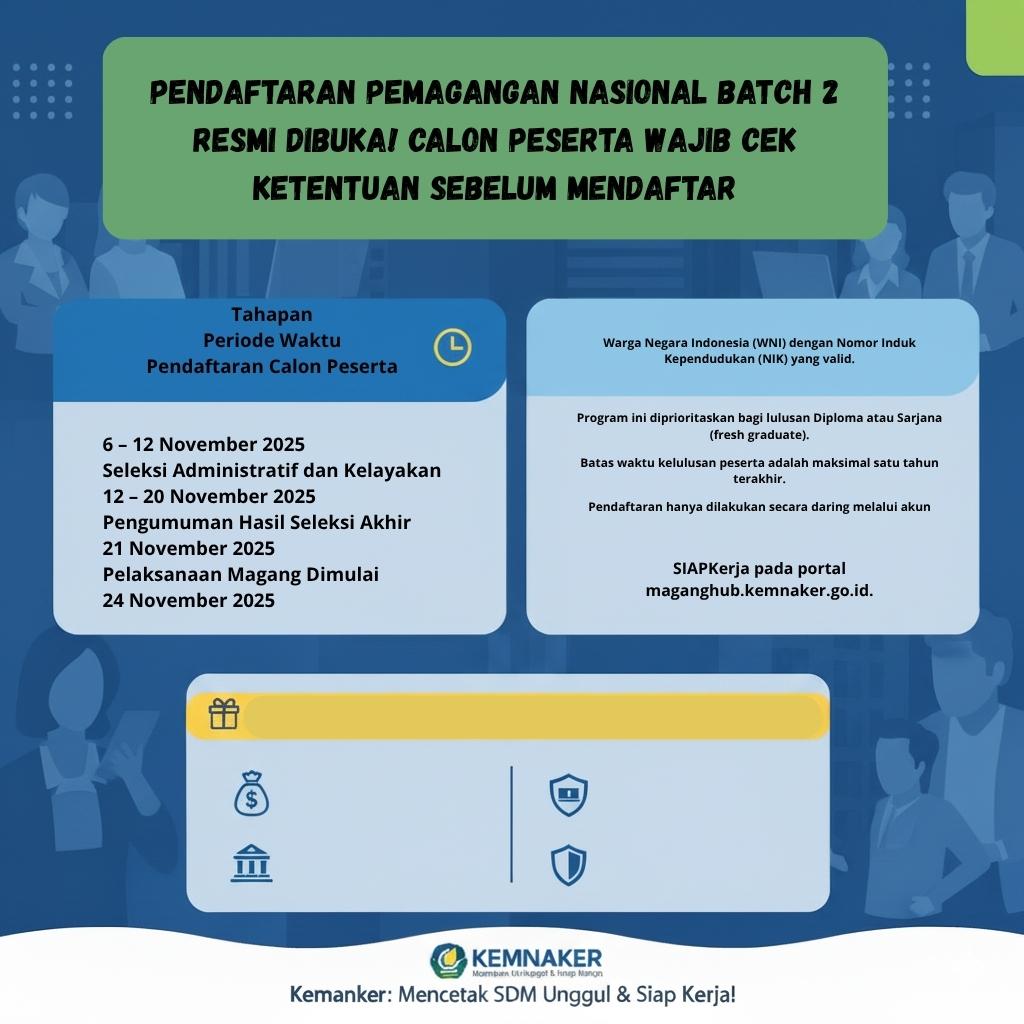 JAKARTA – Kementerian Ketenagakerjaan (Kemnaker) secara resmi membuka pendaftaran untuk program Pemagangan Nasional Batch 2. Program ini ditujukan untuk memberikan kesempatan kepada para pencari kerja, khususnya fresh graduate, untuk mendapatkan pengalaman kerja profesional di perusahaan-perusahaan terkemuka.