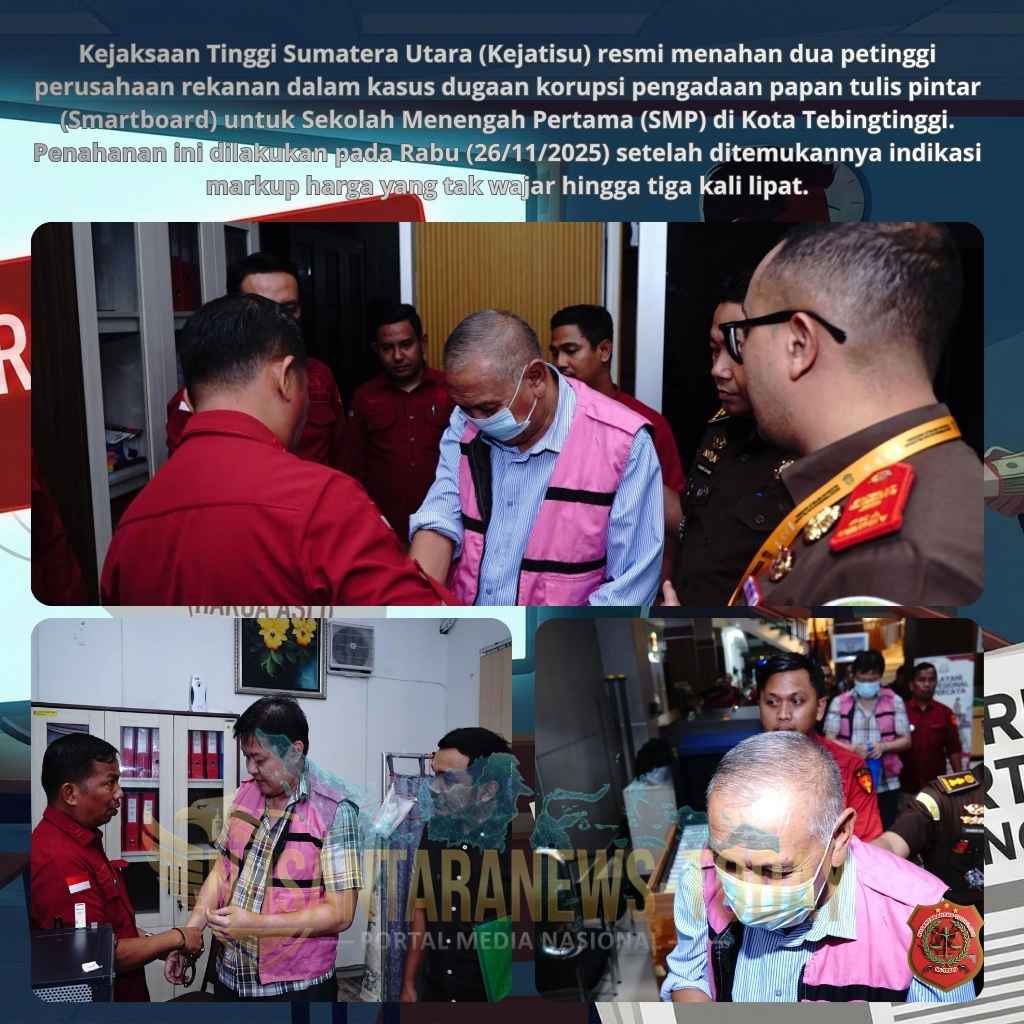 MEDAN, 26 November 2025 – Tabir dugaan korupsi besar-besaran dalam proyek pengadaan papan tulis pintar (Smartboard) untuk Sekolah Menengah Pertama (SMP) di Kota Tebingtinggi akhirnya terbongkar. Kejaksaan Tinggi Sumatera Utara (Kejatisu) mengambil langkah tegas dengan menahan dua petinggi perusahaan rekanan pada Rabu (26/11/2025), setelah menemukan bukti kuat adanya penggelembungan harga (markup) yang dinilai tak wajar hingga tiga kali lipat dari harga asli.