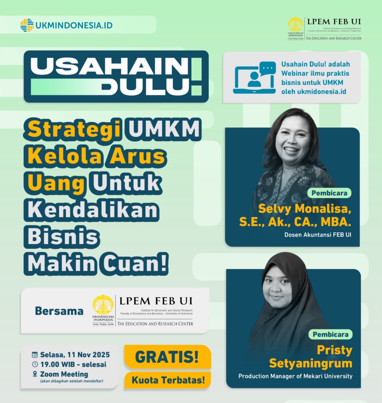 Bagi pelaku usaha yang tertarik untuk ikut serta dan memastikan bisnisnya makin terkendali secara finansial, informasi lengkap mengenai jadwal, pembicara, dan tautan pendaftaran dapat diakses melalui: