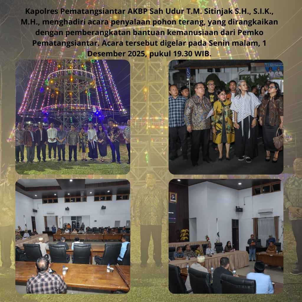 PEMATANGSIANTAR – Kapolres Pematangsiantar AKBP Sah Udur T.M. Sitinjak S.H., S.I.K., M.H., menghadiri acara penyalaan pohon terang, yang dirangkaikan dengan pemberangkatan bantuan kemanusiaan dari Pemko Pematangsiantar. Acara tersebut digelar pada Senin malam, 1 Desember 2025, pukul 19.30 WIB.