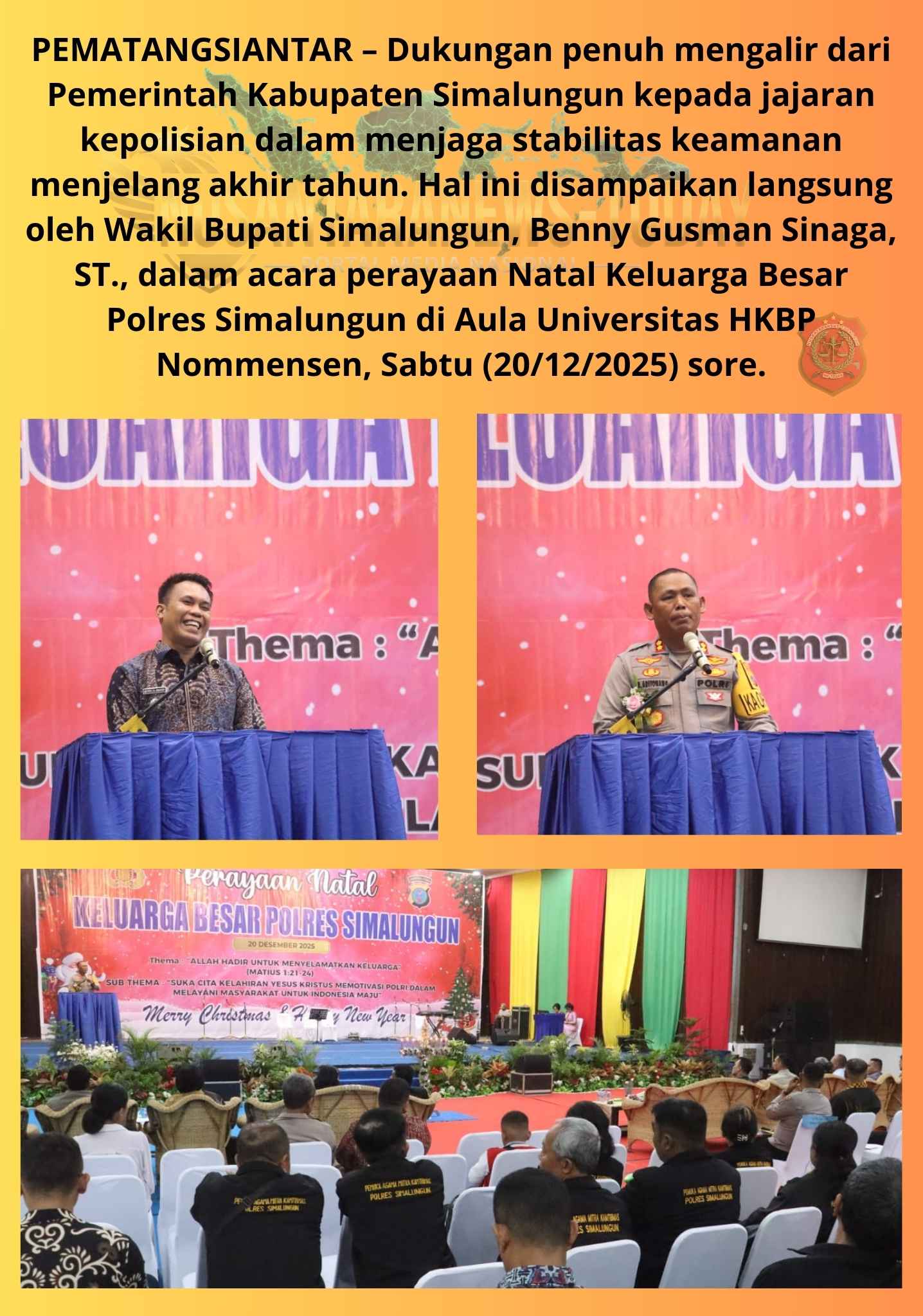 PEMATANGSIANTAR – Dukungan penuh mengalir dari Pemerintah Kabupaten Simalungun kepada jajaran kepolisian dalam menjaga stabilitas keamanan menjelang akhir tahun. Hal ini disampaikan langsung oleh Wakil Bupati Simalungun, Benny Gusman Sinaga, ST., dalam acara perayaan Natal Keluarga Besar Polres Simalungun di Aula Universitas HKBP Nommensen, Sabtu (20/12/2025) sore.