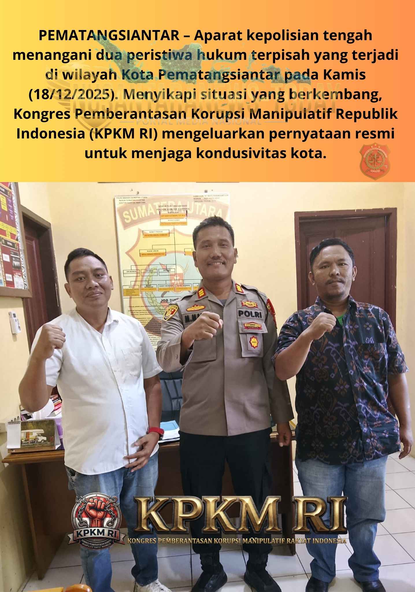 PEMATANGSIANTAR – Aparat kepolisian tengah menangani dua peristiwa hukum terpisah yang terjadi di wilayah Kota Pematangsiantar pada Kamis (18/12/2025). Menyikapi situasi yang berkembang, Kongres Pemberantasan Korupsi Manipulatif Republik Indonesia (KPKM RI) mengeluarkan pernyataan resmi untuk menjaga kondusivitas kota.