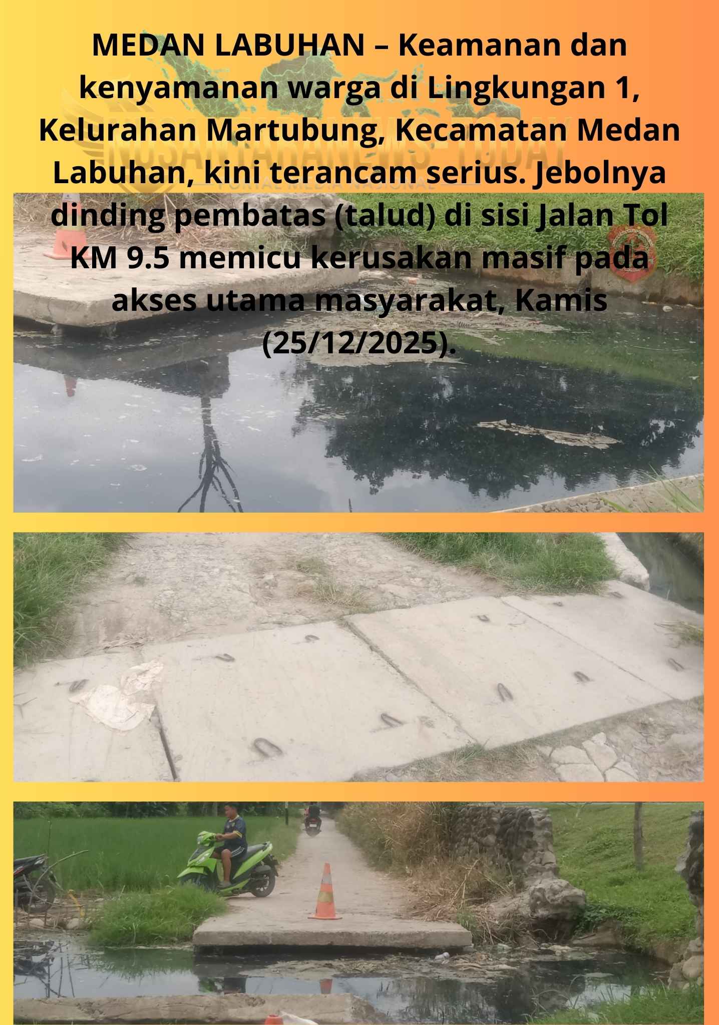 MEDAN LABUHAN – Keamanan dan kenyamanan warga di Lingkungan 1, Kelurahan Martubung, Kecamatan Medan Labuhan, kini terancam serius. Jebolnya dinding pembatas (talud) di sisi Jalan Tol KM 9.5 memicu kerusakan masif pada akses utama masyarakat, Kamis (25/12/2025).