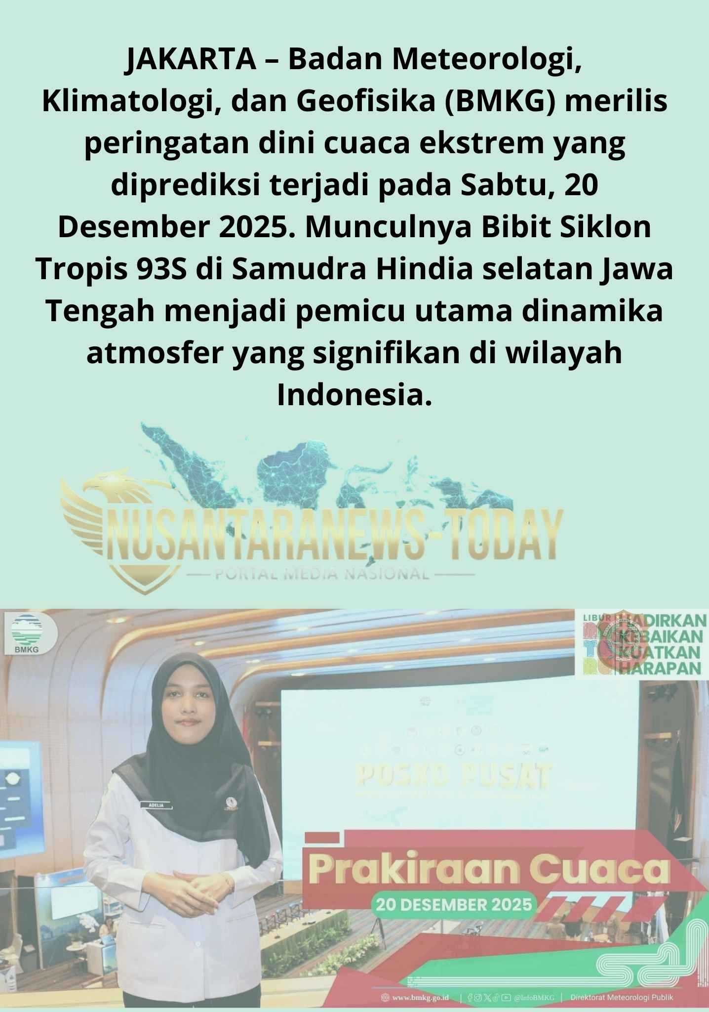 JAKARTA – Badan Meteorologi, Klimatologi, dan Geofisika (BMKG) merilis peringatan dini cuaca ekstrem yang diprediksi terjadi pada Sabtu, 20 Desember 2025. Munculnya Bibit Siklon Tropis 93S di Samudra Hindia selatan Jawa Tengah menjadi pemicu utama dinamika atmosfer yang signifikan di wilayah Indonesia.