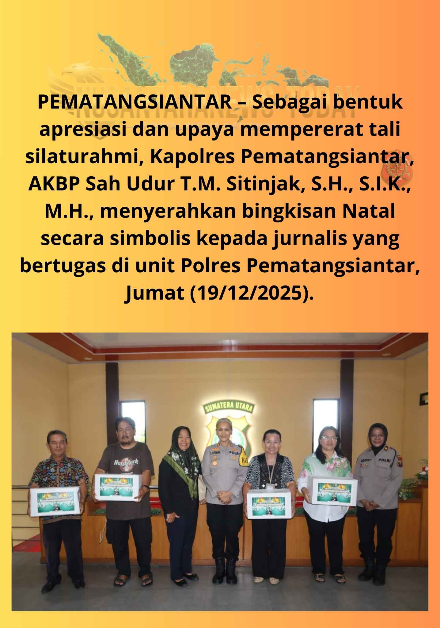 PEMATANGSIANTAR – Sebagai bentuk apresiasi dan upaya mempererat tali silaturahmi, Kapolres Pematangsiantar, AKBP Sah Udur T.M. Sitinjak, S.H., S.I.K., M.H., menyerahkan bingkisan Natal secara simbolis kepada jurnalis yang bertugas di unit Polres Pematangsiantar, Jumat (19/12/2025).