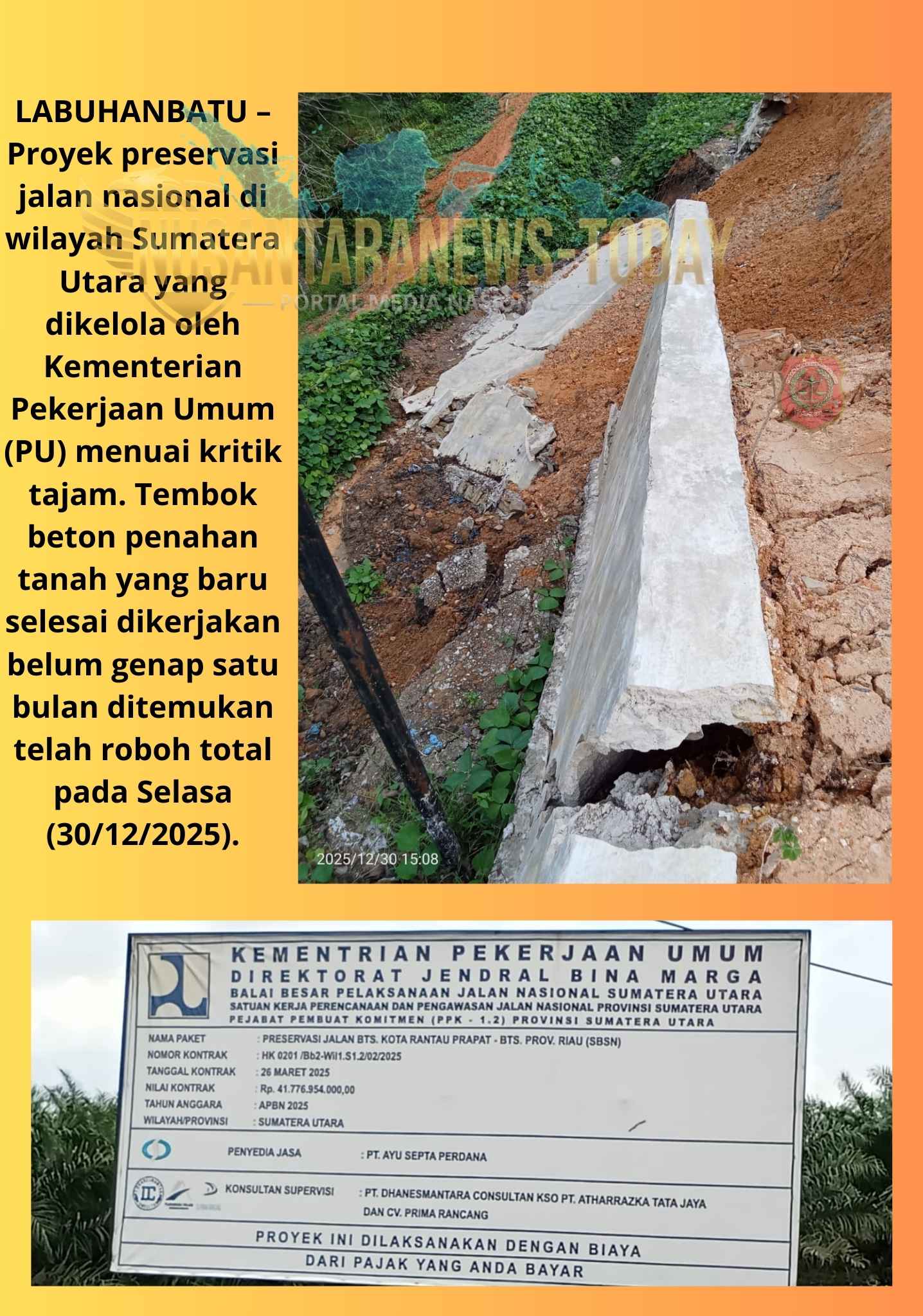 LABUHANBATU – Proyek preservasi jalan nasional di wilayah Sumatera Utara yang dikelola oleh Kementerian Pekerjaan Umum (PU) menuai kritik tajam. Tembok beton penahan tanah yang baru selesai dikerjakan belum genap satu bulan ditemukan telah roboh total pada Selasa (30/12/2025).