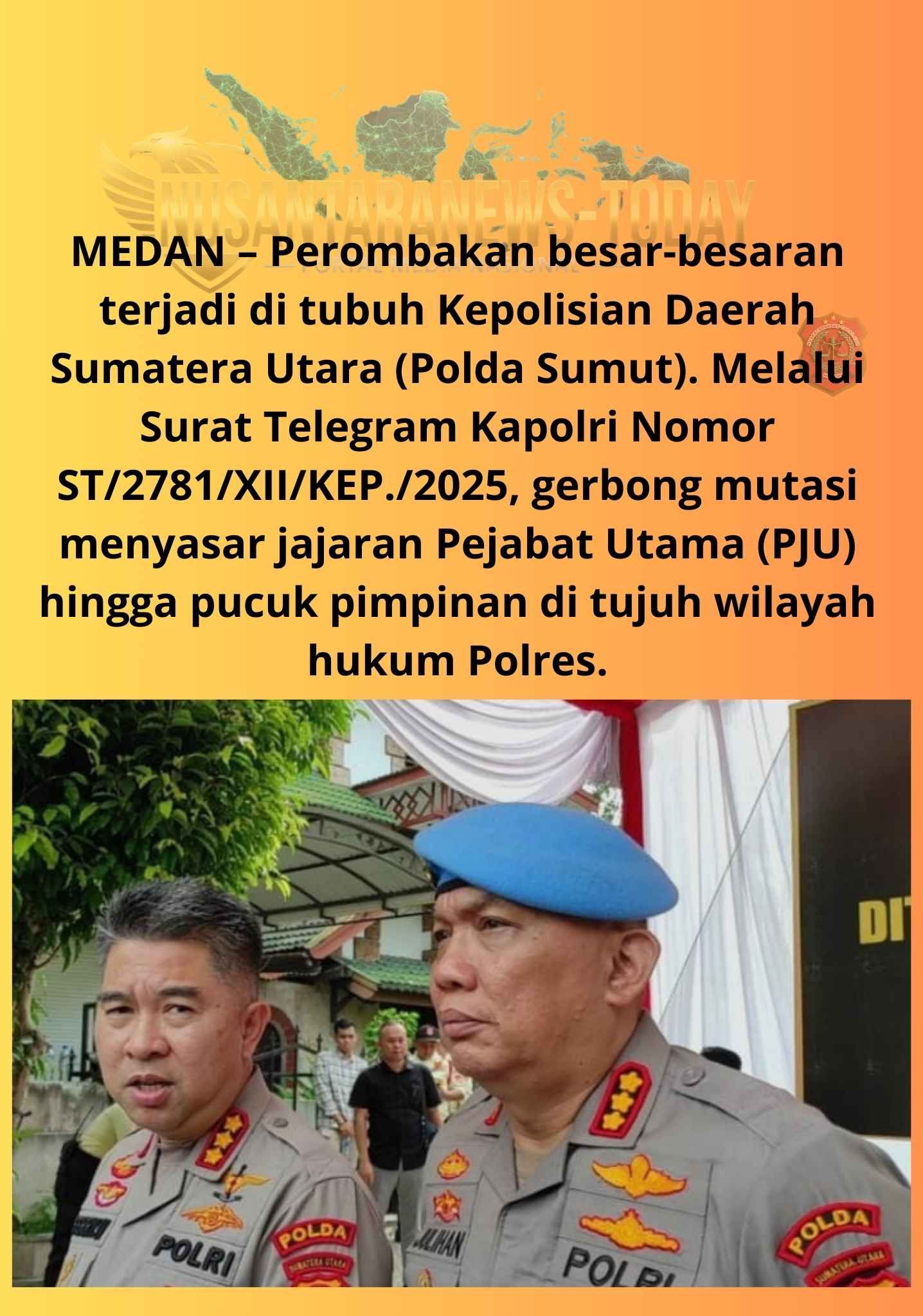 MEDAN – Perombakan besar-besaran terjadi di tubuh Kepolisian Daerah Sumatera Utara (Polda Sumut). Melalui Surat Telegram Kapolri Nomor ST/2781/XII/KEP./2025, gerbong mutasi menyasar jajaran Pejabat Utama (PJU) hingga pucuk pimpinan di tujuh wilayah hukum Polres.