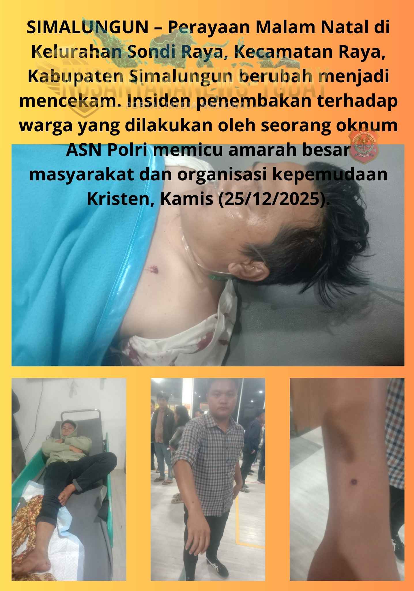 SIMALUNGUN – Perayaan Malam Natal di Kelurahan Sondi Raya, Kecamatan Raya, Kabupaten Simalungun berubah menjadi mencekam. Insiden penembakan terhadap warga yang dilakukan oleh seorang oknum ASN Polri memicu amarah besar masyarakat dan organisasi kepemudaan Kristen, Kamis (25/12/2025).