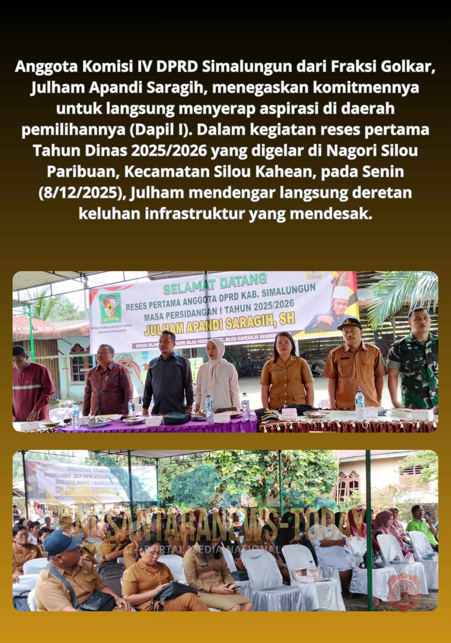 SIMALUNGUN – Anggota Komisi IV DPRD Simalungun dari Fraksi Golkar, Julham Apandi Saragih, menegaskan komitmennya untuk langsung menyerap aspirasi di daerah pemilihannya (Dapil I). Dalam kegiatan reses pertama Tahun Dinas 2025/2026 yang digelar di Nagori Silou Paribuan, Kecamatan Silou Kahean, pada Senin (8/12/2025), Julham mendengar langsung deretan keluhan infrastruktur yang mendesak.