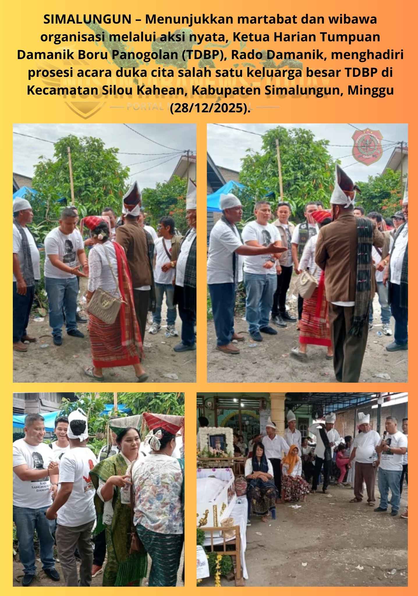 SIMALUNGUN – Menunjukkan martabat dan wibawa organisasi melalui aksi nyata, Ketua Harian Tumpuan Damanik Boru Panogolan (TDBP), Rado Damanik, menghadiri prosesi acara duka cita salah satu keluarga besar TDBP di Kecamatan Silou Kahean, Kabupaten Simalungun, Minggu (28/12/2025).