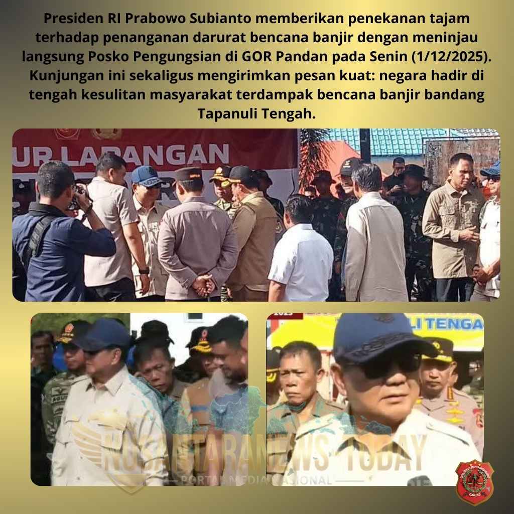 PANDAN, SUMATERA UTARA – Presiden RI Prabowo Subianto memberikan penekanan tajam terhadap penanganan darurat bencana banjir dengan meninjau langsung Posko Pengungsian di GOR Pandan pada Senin (1/12/2025). Kunjungan ini sekaligus mengirimkan pesan kuat: negara hadir di tengah kesulitan masyarakat terdampak bencana banjir bandang Tapanuli Tengah.