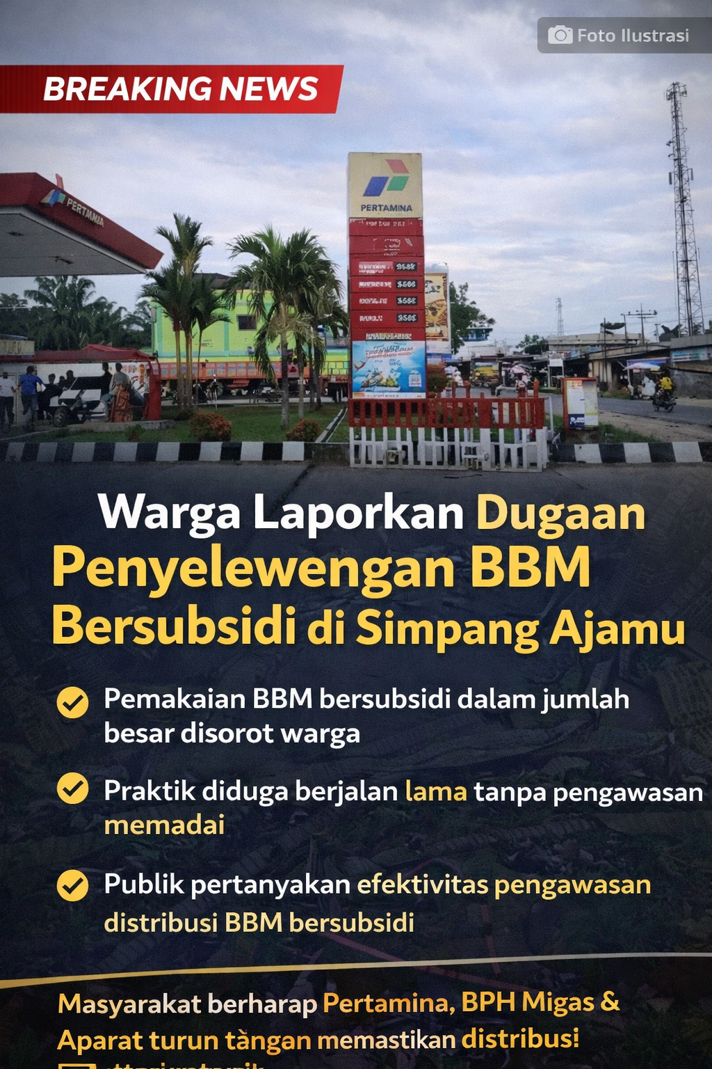 AJAMU – Praktik penyelewengan Bahan Bakar Minyak (BBM) bersubsidi di SPBU 14.214.223 Simpang Ajamu diduga berjalan mulus tanpa tersentuh hukum. Aktivitas yang merugikan keuangan negara ini disinyalir tetap eksis karena adanya “perlindungan” kuat dari oknum aparat penegak hukum dan oknum TNI.