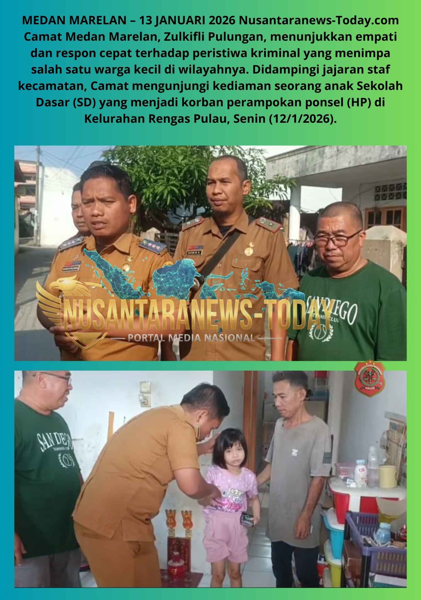 Camat Medan Marelan, Zulkifli Pulungan, menunjukkan empati dan respon cepat terhadap peristiwa kriminal yang menimpa salah satu warga kecil di wilayahnya. Didampingi jajaran staf kecamatan, Camat mengunjungi kediaman seorang anak Sekolah Dasar (SD) yang menjadi korban perampokan ponsel (HP) di Kelurahan Rengas Pulau, Senin (12/1/2026).