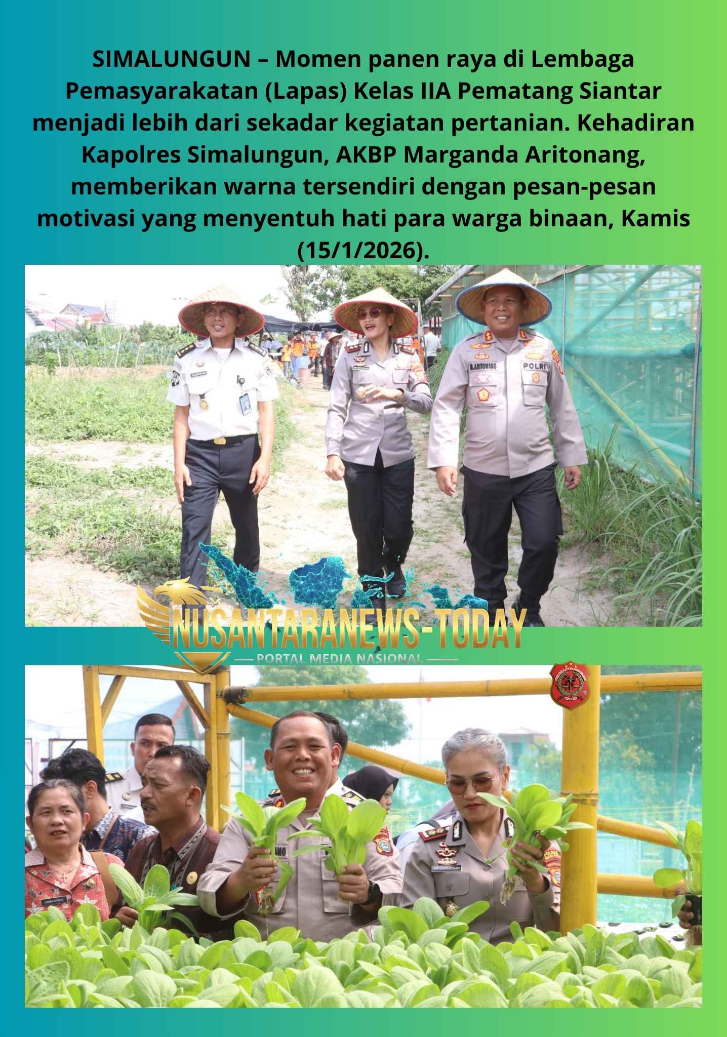 SIMALUNGUN – Momen panen raya di Lembaga Pemasyarakatan (Lapas) Kelas IIA Pematang Siantar menjadi lebih dari sekadar kegiatan pertanian. Kehadiran Kapolres Simalungun, AKBP Marganda Aritonang, memberikan warna tersendiri dengan pesan-pesan motivasi yang menyentuh hati para warga binaan, Kamis (15/1/2026).