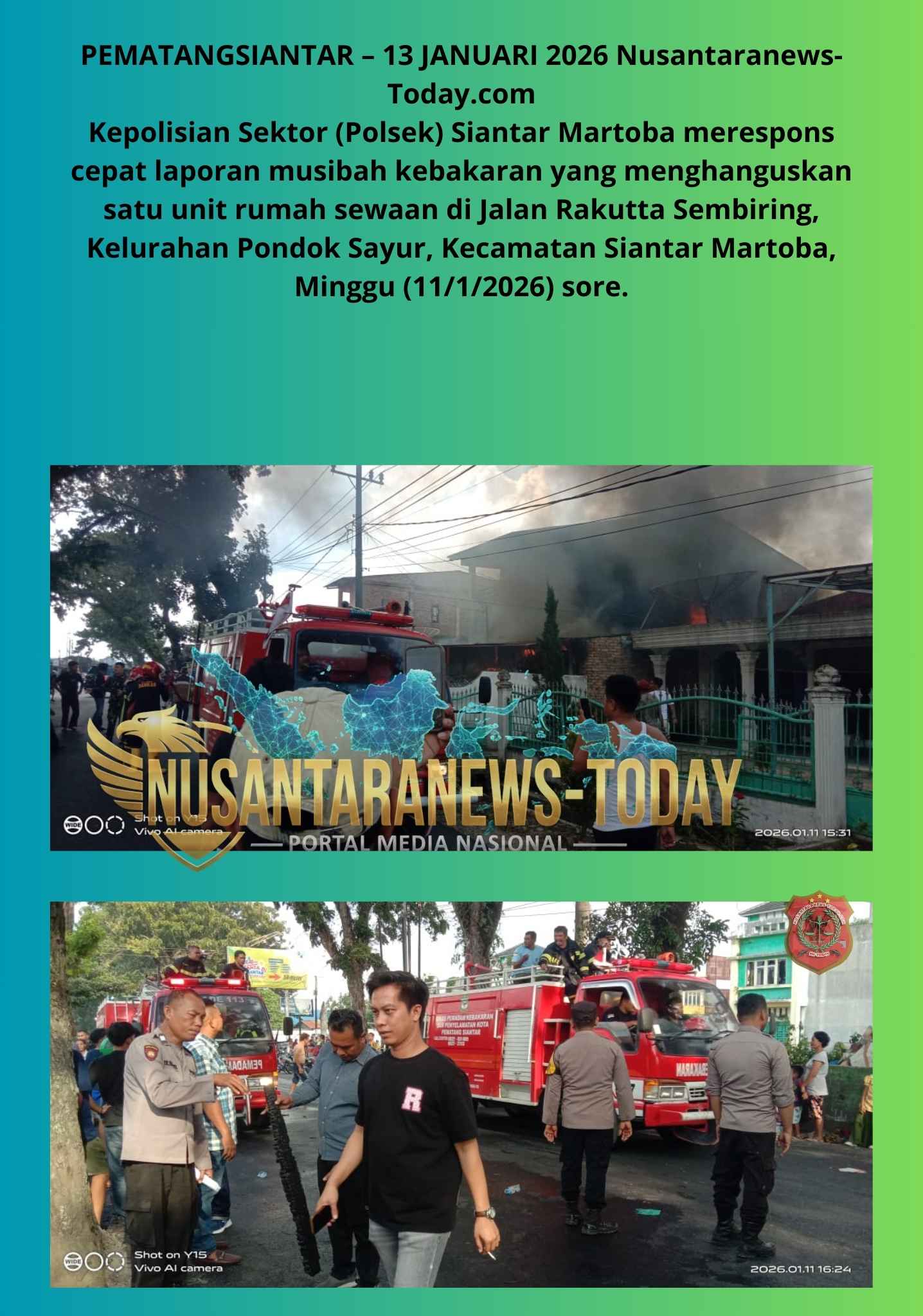 Kepolisian Sektor (Polsek) Siantar Martoba merespons cepat laporan musibah kebakaran yang menghanguskan satu unit rumah sewaan di Jalan Rakutta Sembiring, Kelurahan Pondok Sayur, Kecamatan Siantar Martoba, Minggu (11/1/2026) sore.