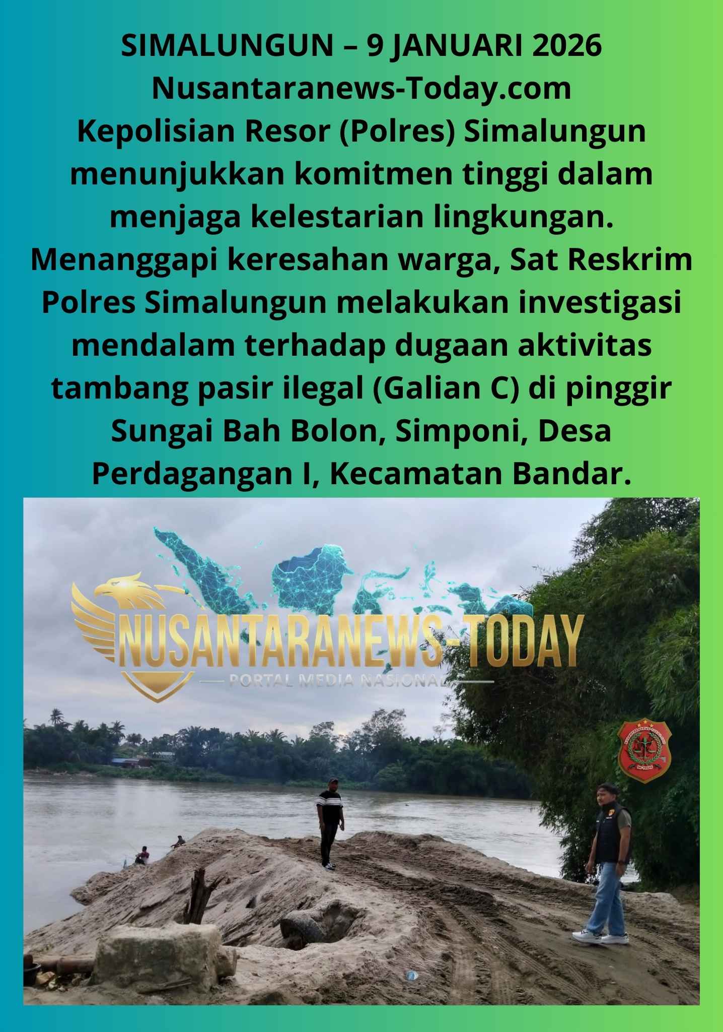 Kepolisian Resor (Polres) Simalungun menunjukkan komitmen tinggi dalam menjaga kelestarian lingkungan. Menanggapi keresahan warga, Sat Reskrim Polres Simalungun melakukan investigasi mendalam terhadap dugaan aktivitas tambang pasir ilegal (Galian C) di pinggir Sungai Bah Bolon, Simponi, Desa Perdagangan I, Kecamatan Bandar.