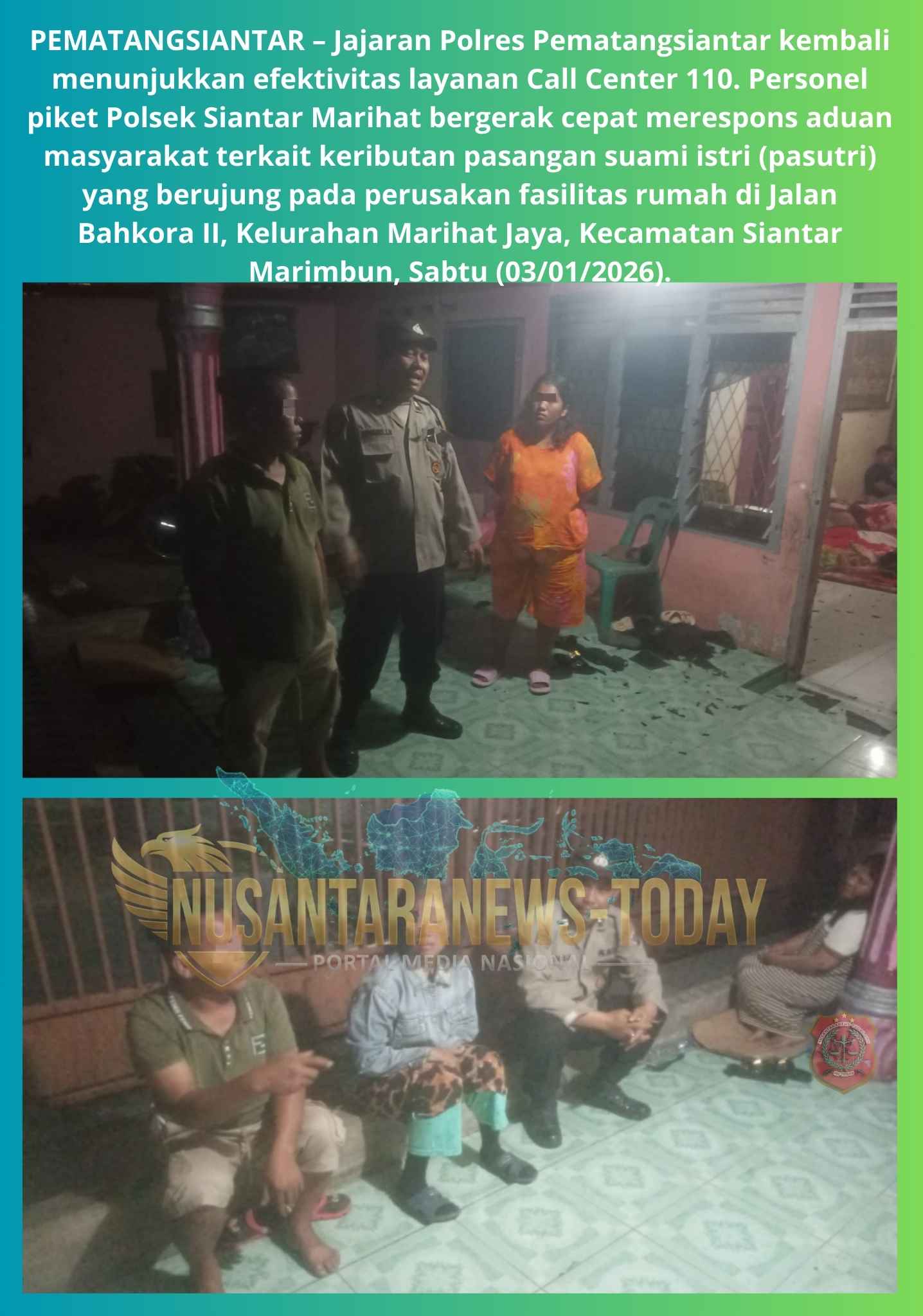 PEMATANGSIANTAR – Jajaran Polres Pematangsiantar kembali menunjukkan efektivitas layanan Call Center 110. Personel piket Polsek Siantar Marihat bergerak cepat merespons aduan masyarakat terkait keributan pasangan suami istri (pasutri) yang berujung pada perusakan fasilitas rumah di Jalan Bahkora II, Kelurahan Marihat Jaya, Kecamatan Siantar Marimbun, Sabtu (03/01/2026).