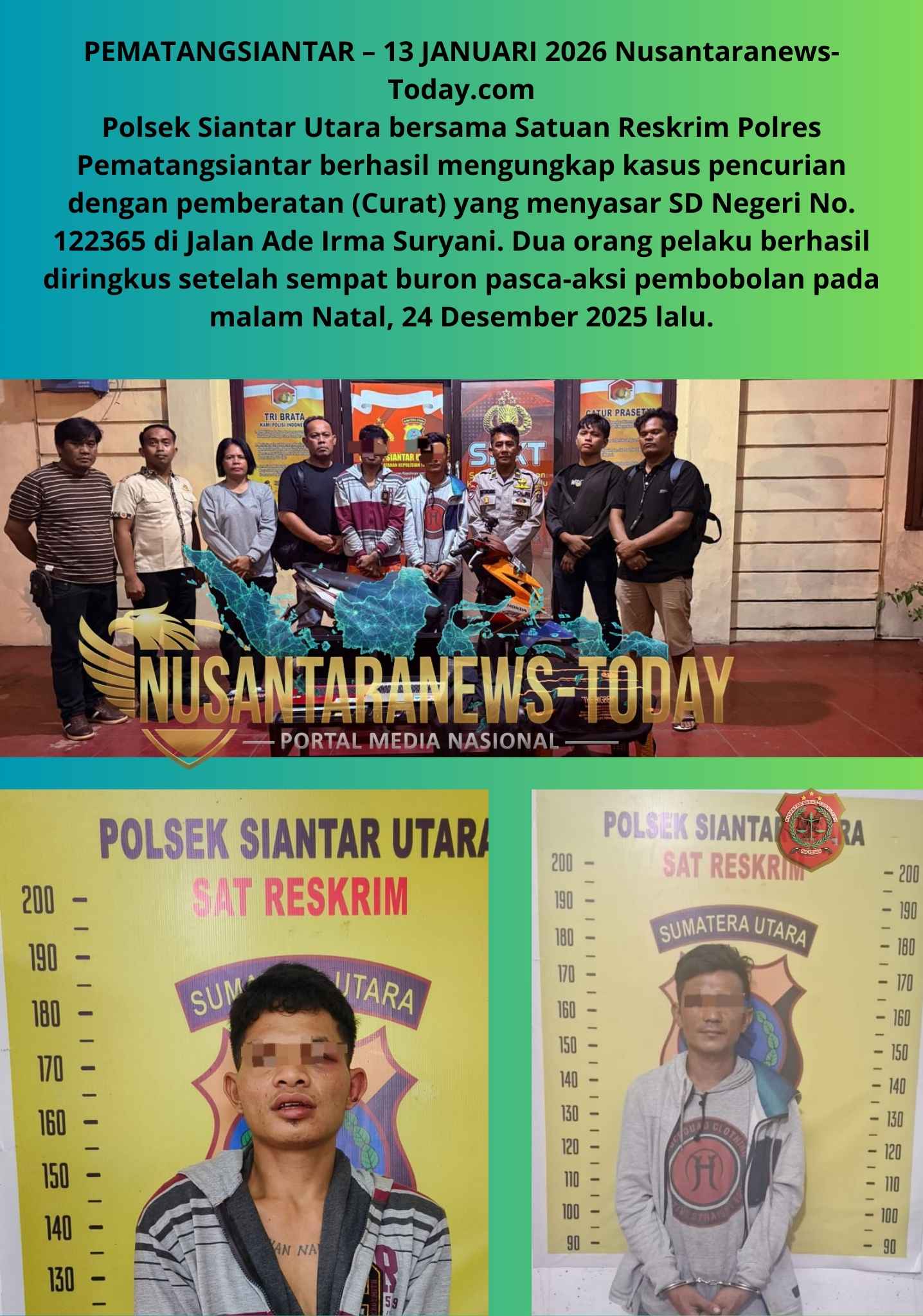 Polsek Siantar Utara bersama Satuan Reskrim Polres Pematangsiantar berhasil mengungkap kasus pencurian dengan pemberatan (Curat) yang menyasar SD Negeri No. 122365 di Jalan Ade Irma Suryani. Dua orang pelaku berhasil diringkus setelah sempat buron pasca-aksi pembobolan pada malam Natal, 24 Desember 2025 lalu.
