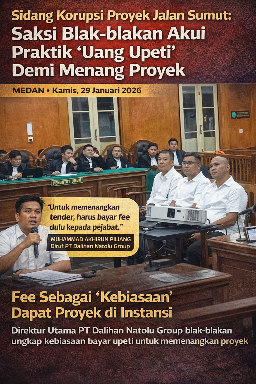 MEDAN – Fakta mengejutkan terungkap dalam sidang lanjutan perkara korupsi proyek pembangunan jalan di Sumatera Utara yang digelar di Pengadilan Negeri Medan, Kamis (29/1/2026). Sejumlah saksi dari pihak rekanan mengakui secara terbuka bahwa pemberian fee merupakan “syarat tidak tertulis” yang harus dipenuhi untuk mendapatkan proyek di berbagai instansi.