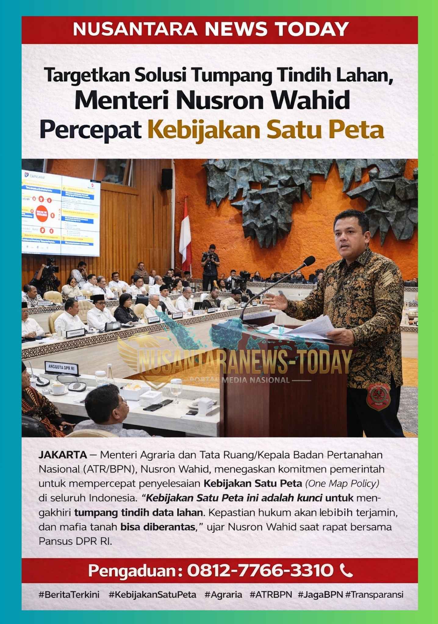 JAKARTA – Menteri Agraria dan Tata Ruang/Kepala Badan Pertanahan Nasional (ATR/BPN), Nusron Wahid, menegaskan komitmen pemerintah untuk mempercepat penyelesaian Kebijakan Satu Peta (One Map Policy) di seluruh Indonesia. Komitmen ini disampaikan dalam Rapat Kerja (Raker) bersama Pansus DPR RI guna mencari solusi permanen atas sengkarut pertanahan nasional.