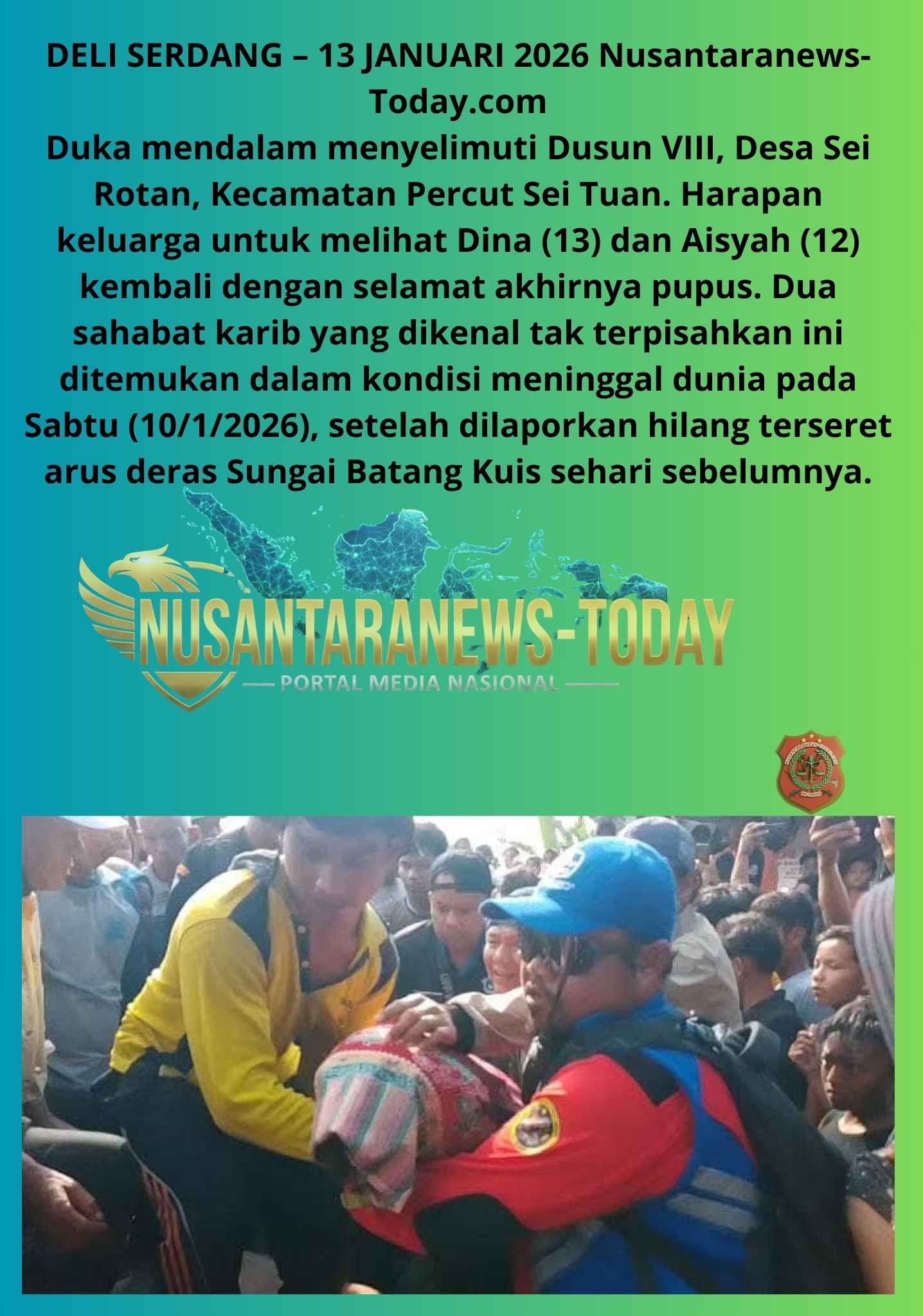 Duka mendalam menyelimuti Dusun VIII, Desa Sei Rotan, Kecamatan Percut Sei Tuan. Harapan keluarga untuk melihat Dina (13) dan Aisyah (12) kembali dengan selamat akhirnya pupus. Dua sahabat karib yang dikenal tak terpisahkan ini ditemukan dalam kondisi meninggal dunia pada Sabtu (10/1/2026), setelah dilaporkan hilang terseret arus deras Sungai Batang Kuis sehari sebelumnya.