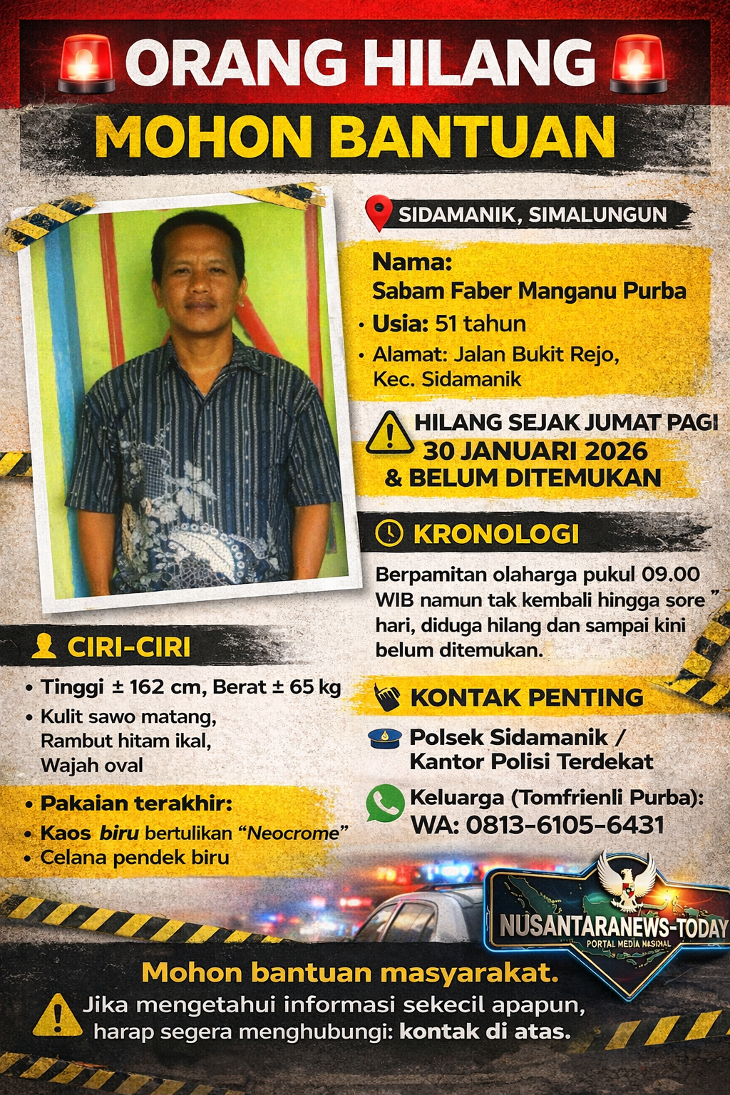 SIDAMANIK, SIMALUNGUN – Seorang warga Jalan Bukit Rejo, Kecamatan Sidamanik, bernama Sabam Faber Manganu Purba (51), dilaporkan hilang sejak Jumat pagi (30/01/2026). Hingga berita ini diturunkan, keberadaan korban belum ditemukan meski pihak keluarga dan warga telah melakukan penyisiran di berbagai titik.