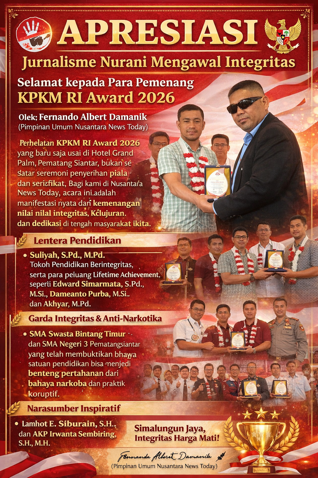 Perhelatan KPKM RI Award 2026 yang baru saja usai di Hotel Grand Palm, Pematang Siantar, bukan sekadar seremoni penyerahan piala dan sertifikat. Bagi kami di Nusantara News Today dan keluarga besar KPKM RI, acara ini adalah manifestasi nyata dari kemenangan nilai-nilai integritas, kejujuran, dan dedikasi di tengah masyarakat kita.