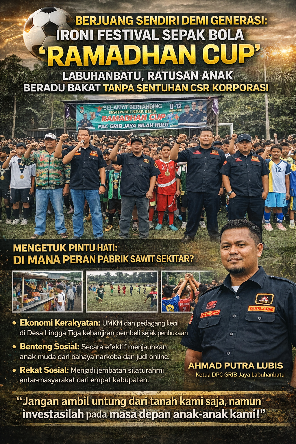 “Kami tidak ingin api semangat anak-anak ini padam hanya karena keterbatasan biaya. Kami mengundang pemerintah dan perusahaan untuk hadir di event selanjutnya. Jangan hanya ambil keuntungan dari tanah kami, tapi investasilah pada masa depan anak-anak kami,” tutup Edi Simanjuntak dengan nada tegas.