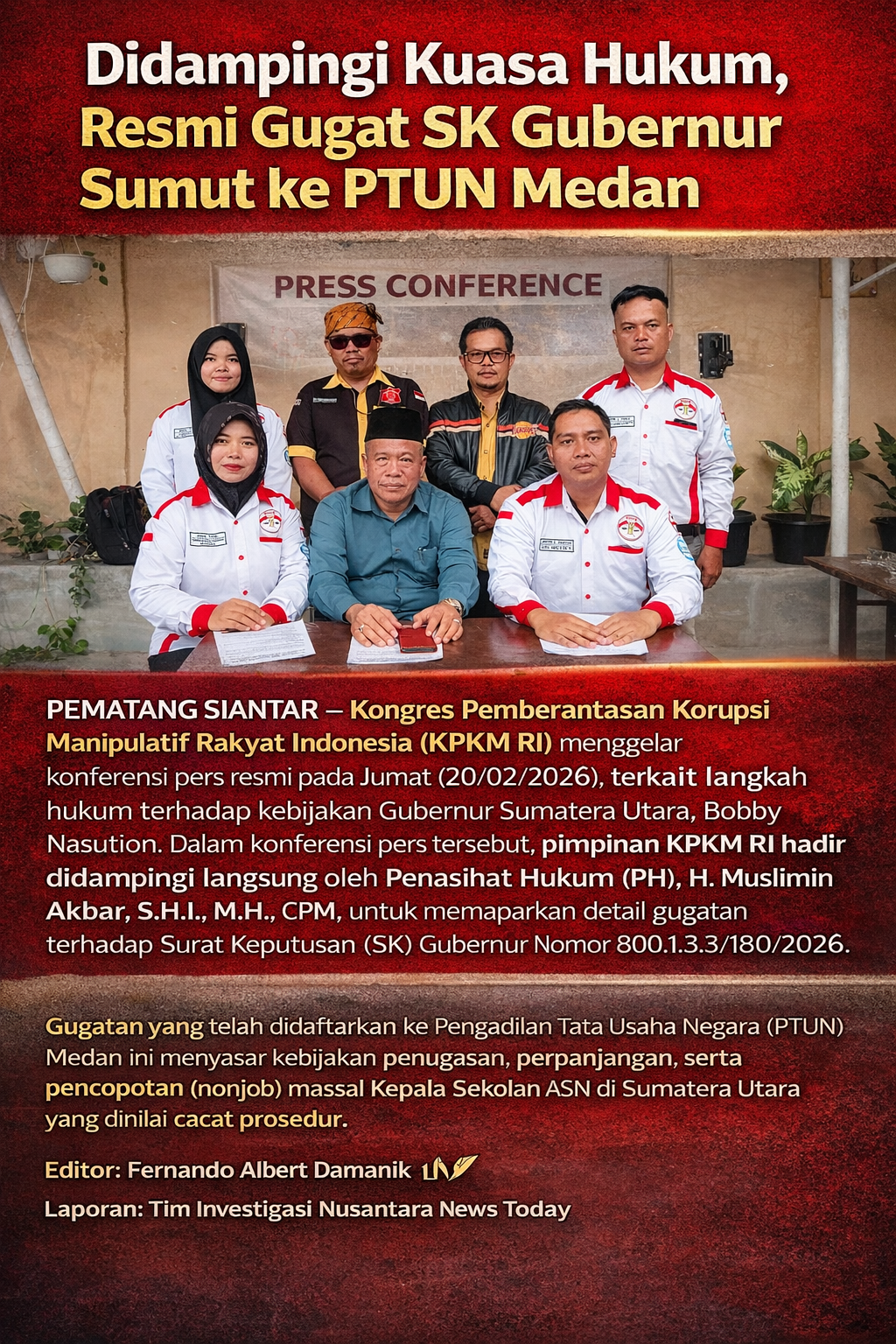 PEMATANG SIANTAR – Kongres Pemberantasan Korupsi Manipulatif Rakyat Indonesia (KPKM RI) menggelar konferensi pers resmi pada Jumat (20/02/2026), terkait langkah hukum terhadap kebijakan Gubernur Sumatera Utara, Bobby Nasution. Dalam konferensi pers tersebut, pimpinan KPKM RI hadir didampingi langsung oleh Penasihat Hukum (PH), H. Muslimin Akbar, S.H.I., M.H., CPM, untuk memaparkan detail gugatan terhadap Surat Keputusan (SK) Gubernur Nomor 800.1.3.3/180/2026.