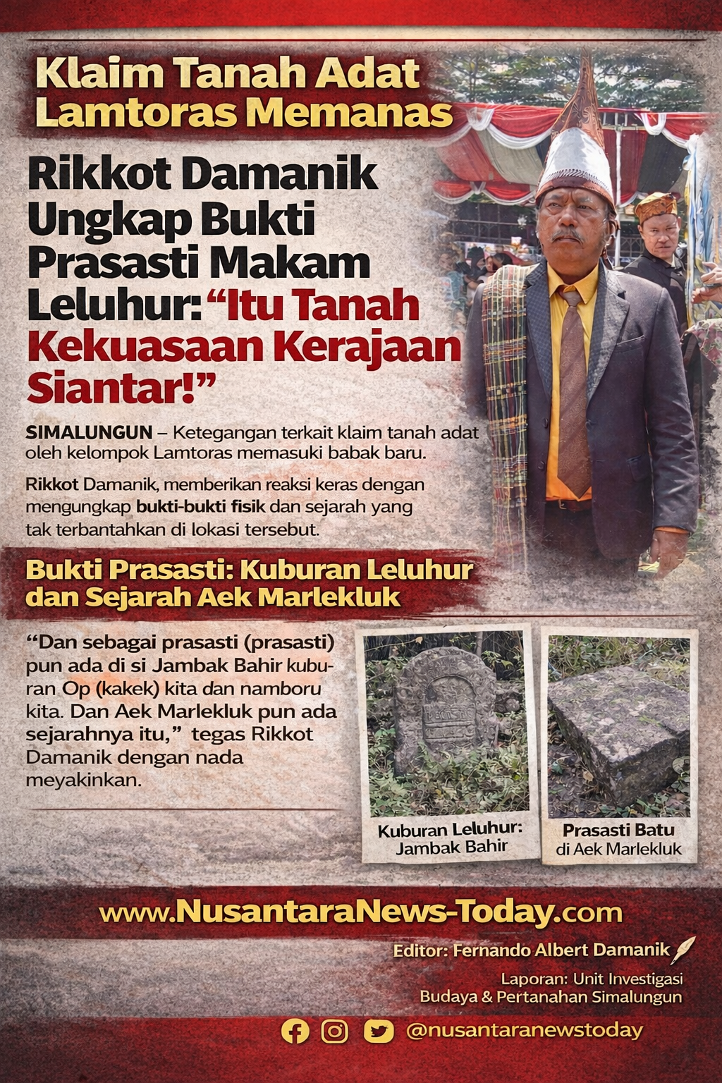 SIMALUNGUN – Ketegangan terkait klaim tanah adat oleh kelompok Lamtoras memasuki babak baru. Tokoh masyarakat , Rikkot Damanik, memberikan reaksi keras dengan mengungkap bukti-bukti fisik dan sejarah yang tak terbantahkan di lokasi tersebut.