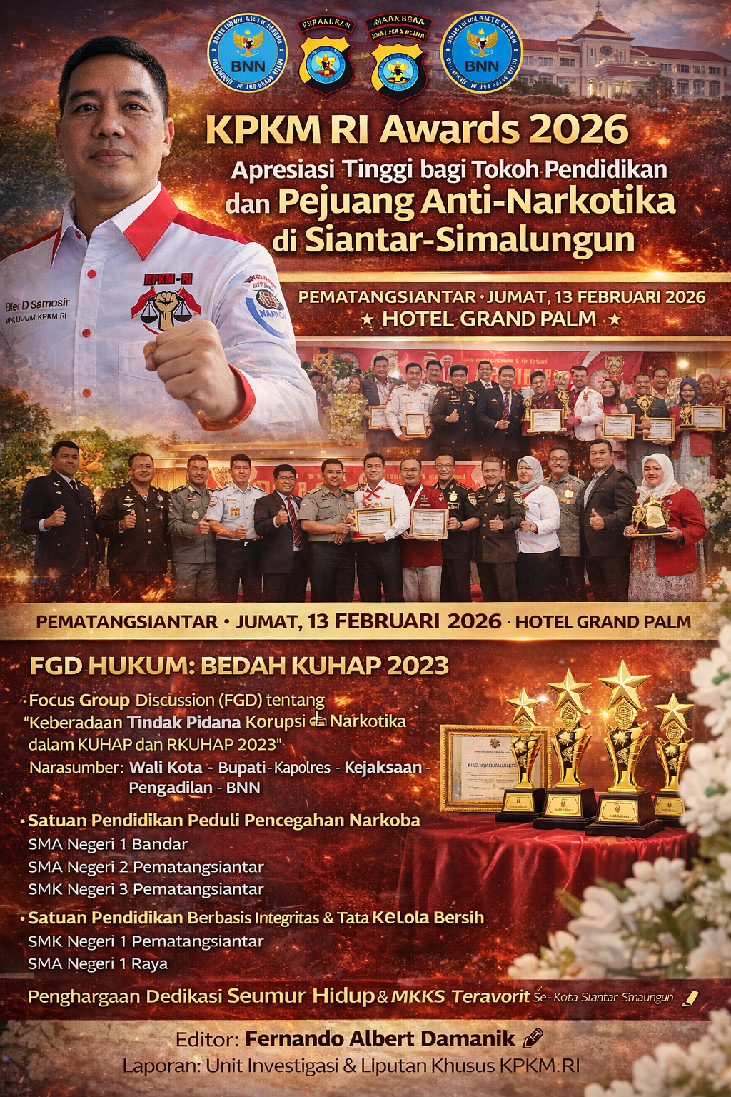 PEMATANGSIANTAR – Lembaga Kongres Pemberantasan Korupsi Manipulatif Rakyat Indonesia (KPKM RI) menggelar perhelatan akbar bertajuk “Education & Anti-Narcotics KPKM RI Awards 2026”. Acara yang berlangsung meriah di Hotel Grand Palm, Pematangsiantar, Jumat (13/02/2026), menjadi panggung apresiasi bagi individu dan instansi yang berdedikasi dalam dunia pendidikan serta pemberantasan narkoba.