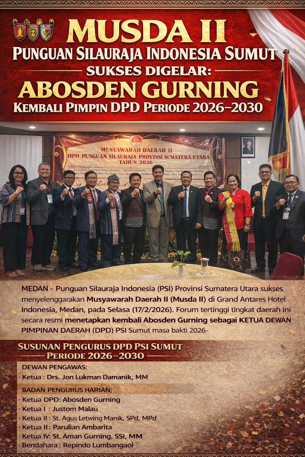 MEDAN – Punguan Silauraja Indonesia (PSI) Provinsi Sumatera Utara sukses menyelenggarakan Musyawarah Daerah II (Musda II) di Grand Antares Hotel Indonesia, Medan, pada Selasa (17/2/2026). Forum tertinggi tingkat daerah ini secara resmi menetapkan kembali Abosden Gurning sebagai Ketua Dewan Pimpinan Daerah (DPD) PSI Sumut masa bakti 2026–2030.
