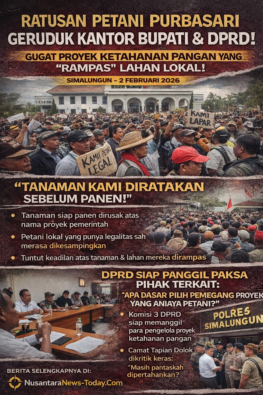 SIMALUNGUN – Aroma ketidakadilan menyengat di balik proyek Ketahanan Pangan di Kabupaten Simalungun. Merasa dijadikan “penonton” bahkan korban di tanah sendiri, ratusan petani asal Purbasari menggelar aksi unjuk rasa besar-besaran dengan mengepung tiga titik sentral kekuasaan: Kantor Bupati, Gedung DPRD, dan Mapolres Simalungun, Senin (02/02/2026).