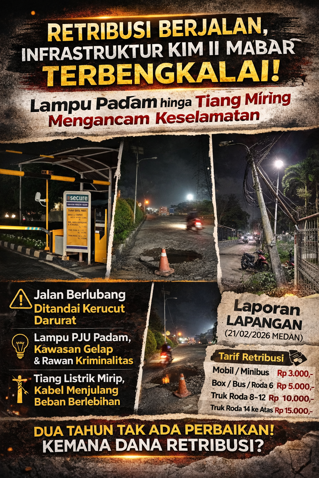 MEDAN – Kondisi infrastruktur di Kawasan Industri Medan (KIM) II Mabar, Medan, semakin memprihatinkan. Meski pemungutan retribusi melalui gate pass terus berjalan normal, fasilitas publik seperti jalan raya, penerangan, hingga utilitas kabel tampak dibiarkan rusak tanpa perbaikan serius dari pihak pengelola. Pantauan lapangan dilakukan pada Sabtu (21/02/2026).