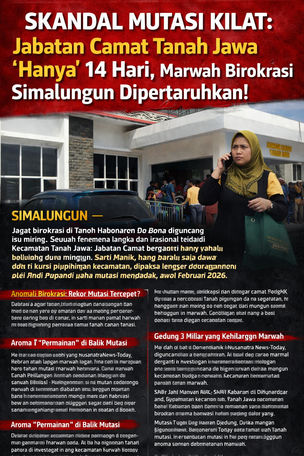 SIMALUNGUN – Jagat birokrasi di Tanoh Habonaron Do Bona diguncang isu miring. Sebuah fenomena langka dan irasional terjadi di Kecamatan Tanah Jawa: Jabatan Camat berganti hanya dalam waktu dua minggu. Sarti Manik, yang baru saja duduk di kursi pimpinan kecamatan, dipaksa lengser dan digantikan oleh Andi Supandri pada mutasi mendadak, awal Februari 2026.