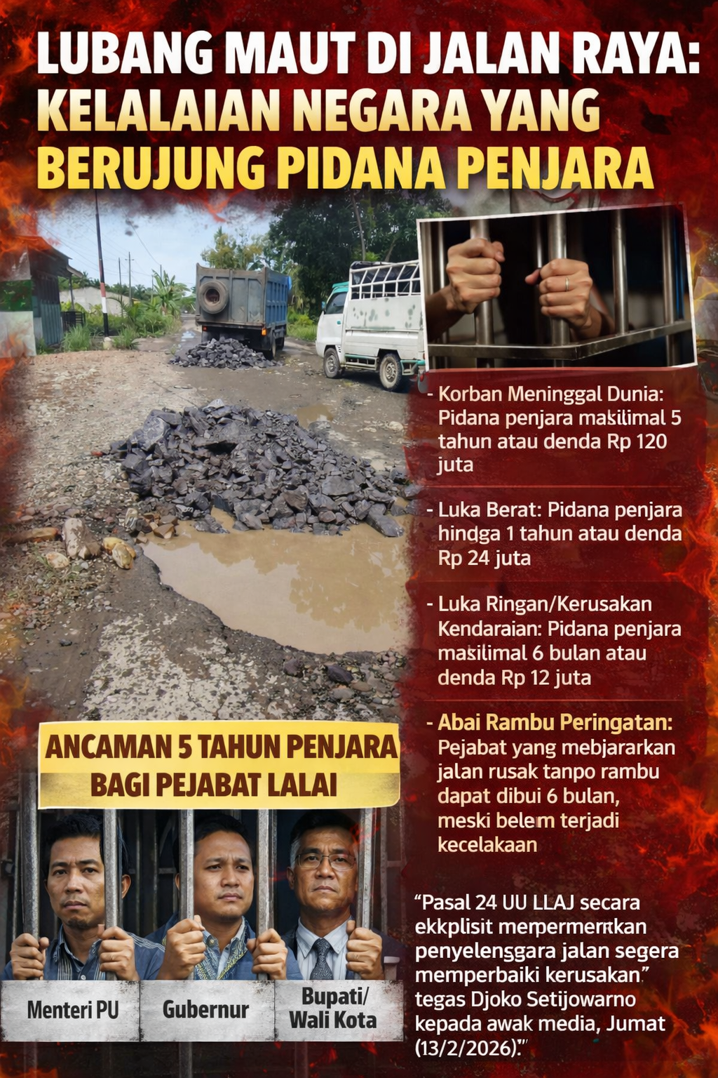 Instrumen hukum nasional kini secara tegas mengancam para pemangku kebijakan—mulai dari Menteri PU, Gubernur, hingga Bupati dan Wali Kota—dengan hukuman penjara jika terbukti abai terhadap kerusakan infrastruktur.