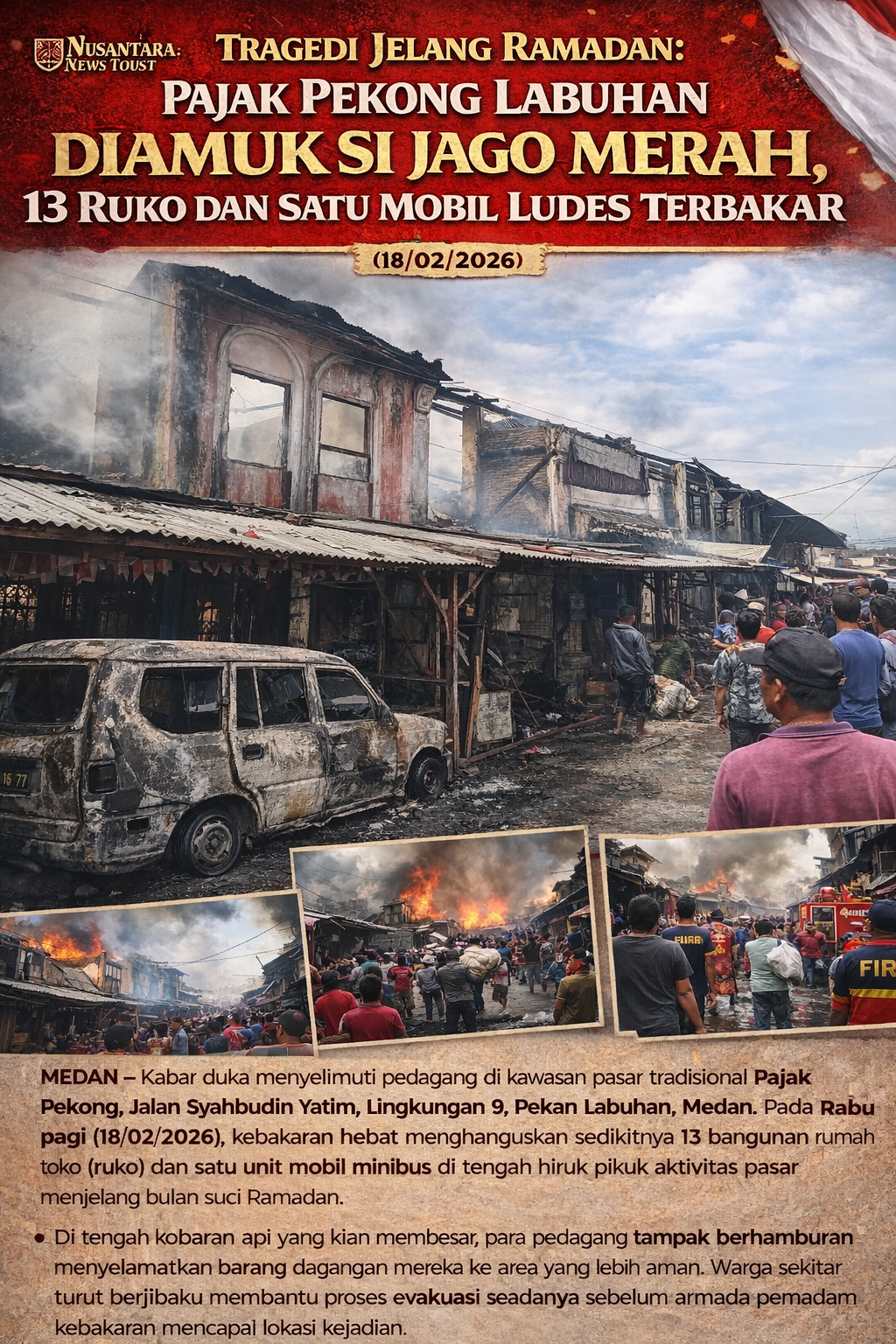 Pimpinan Umum Nusantara News Today, Fernando Albert Damanik, menyampaikan keprihatinan mendalam atas musibah yang menimpa para pedagang, terlebih di saat warga tengah mempersiapkan diri menyambut bulan Ramadan. Melalui media ini, kami mendorong perlunya evaluasi tata ruang pasar tradisional dan sistem keamanan instalasi listrik di area publik guna mencegah tragedi serupa terulang kembali.
