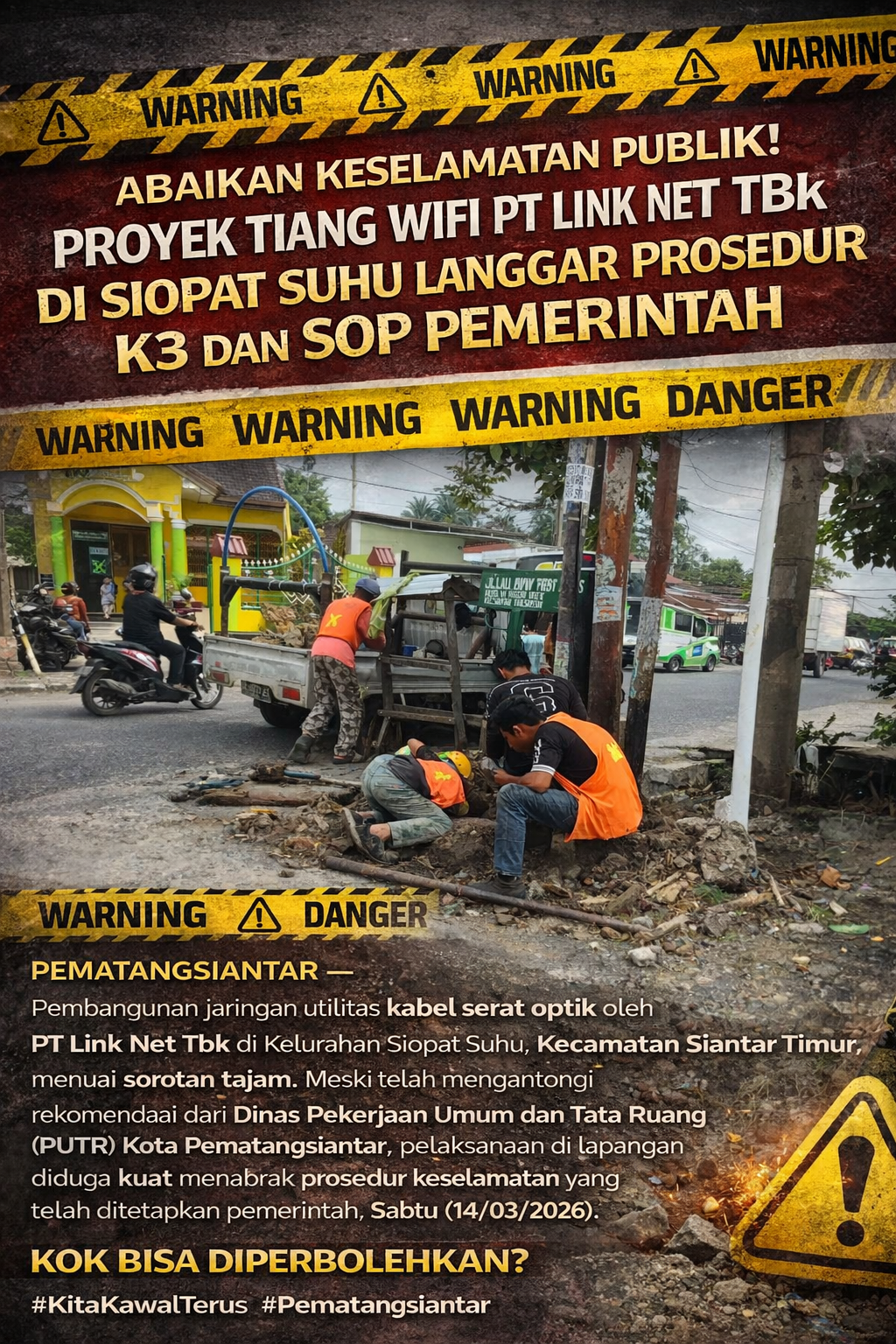 PEMATANGSIANTAR – Pembangunan jaringan utilitas kabel serat optik oleh PT Link Net Tbk di Kelurahan Siopat Suhu, Kecamatan Siantar Timur, menuai sorotan tajam. Meski telah mengantongi rekomendasi dari Dinas Pekerjaan Umum dan Tata Ruang (PUTR) Kota Pematangsiantar, pelaksanaan di lapangan diduga kuat menabrak prosedur keselamatan yang telah ditetapkan pemerintah, Sabtu (14/03/2026).